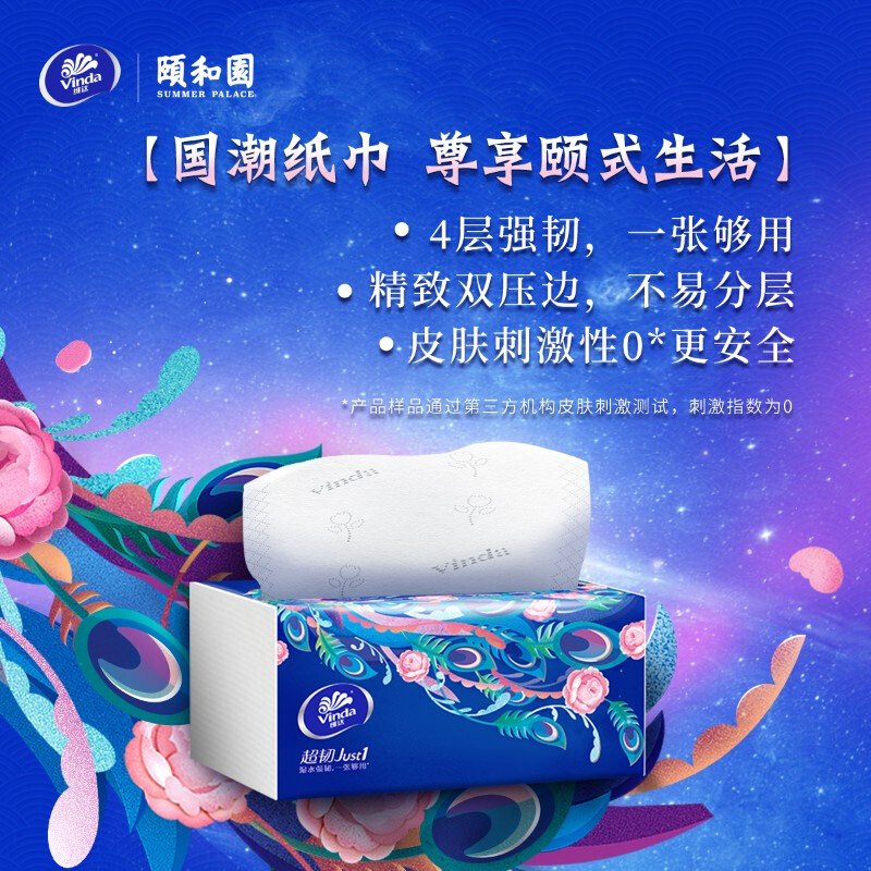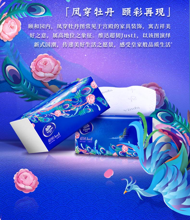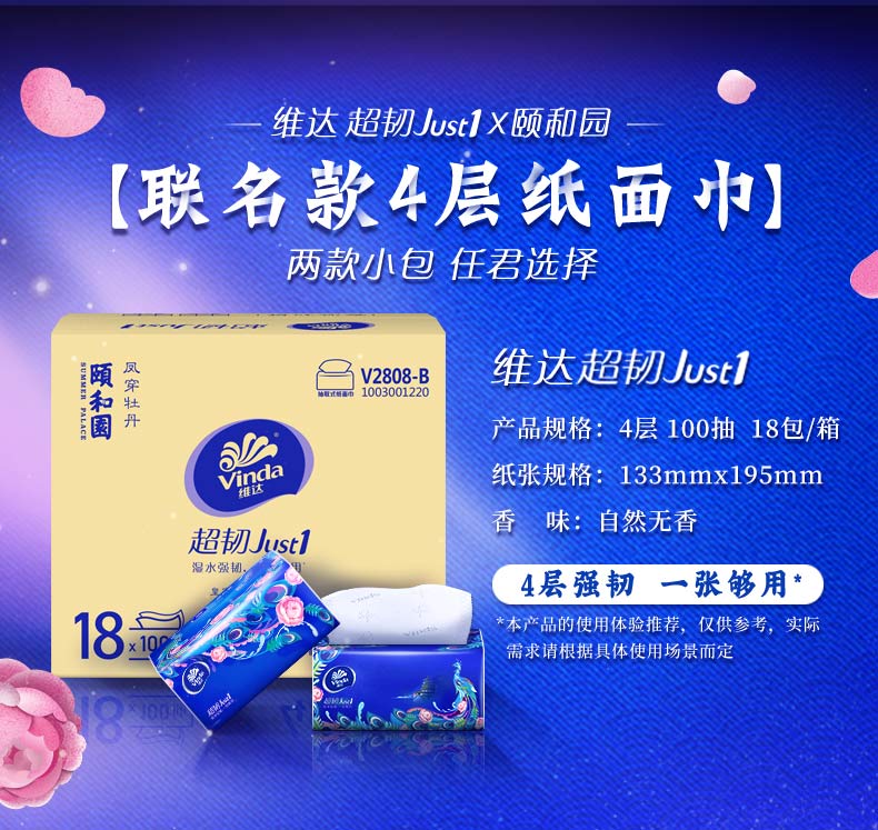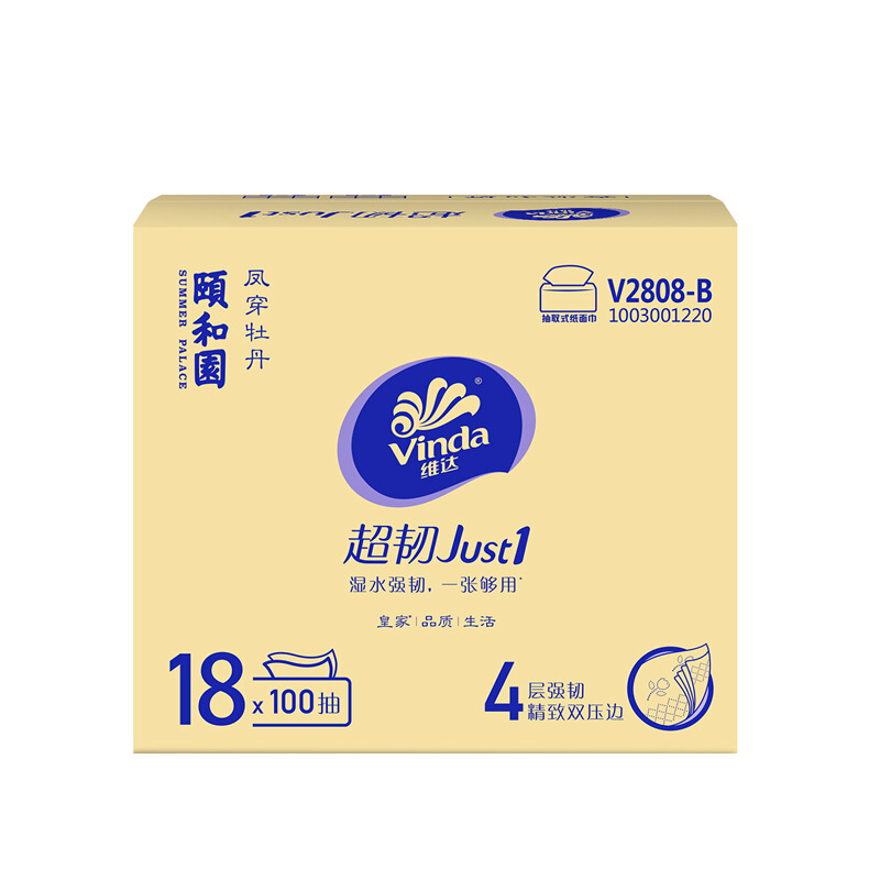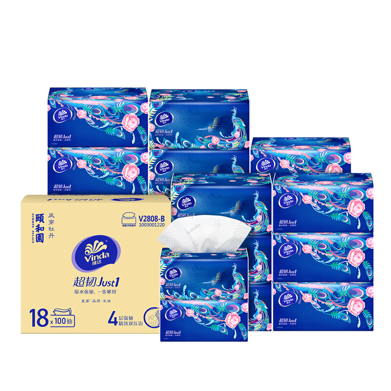 - 商品名称:维达(Vinda) 抽纸纸巾 超韧Just 1 颐和园IP软抽S码4层100抽*18包(凤穿牡丹)整箱装 抽取式纸巾