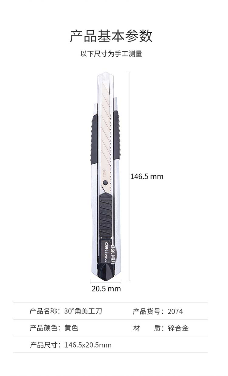 商品名称:得力(deli)30°角自锁美工刀 锌合金裁纸刀/壁纸刀 灰色2074