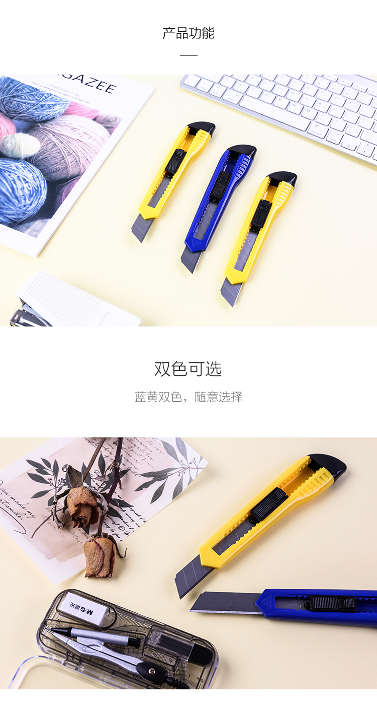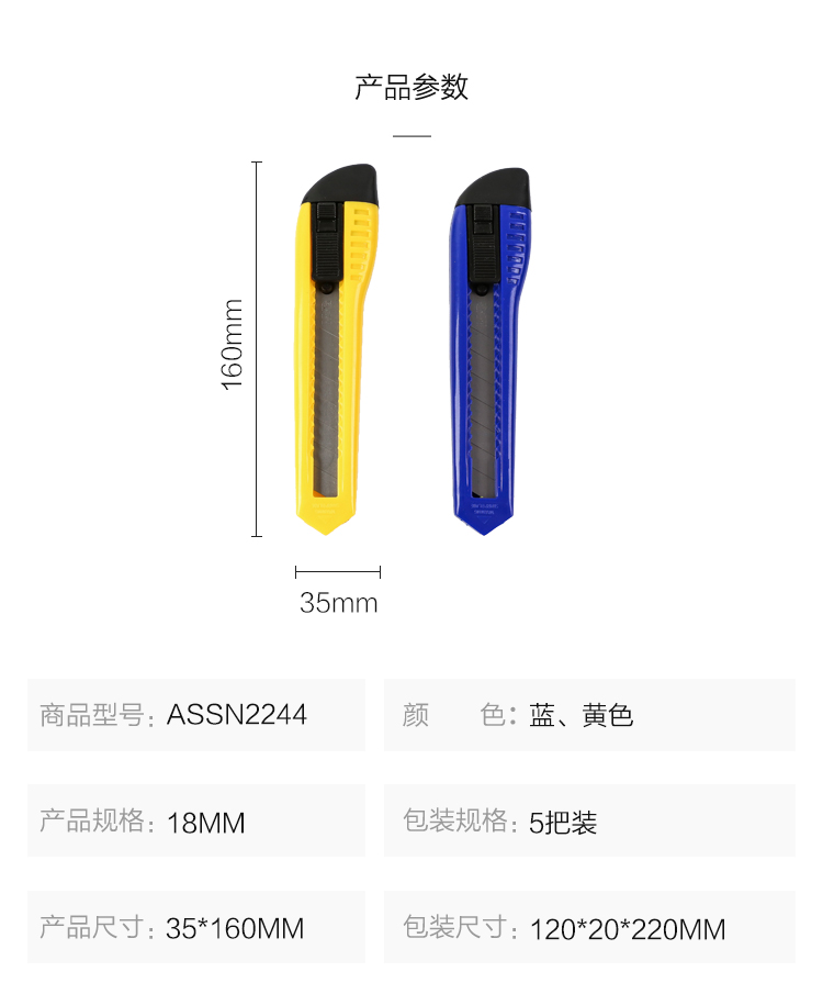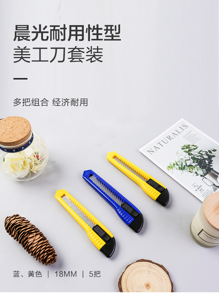 - 商品名称:晨光(M&G)文具18mm蓝黄双色大号美工刀 耐用型裁纸刀壁纸刀 多功能刀子 5把装ASSN2244