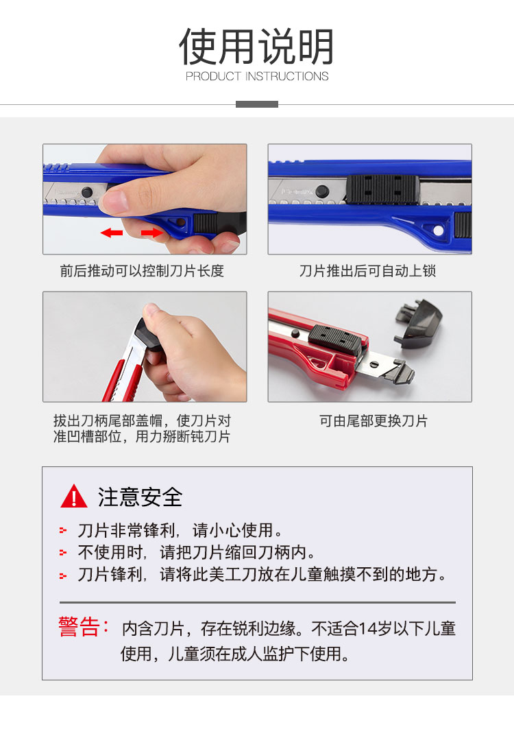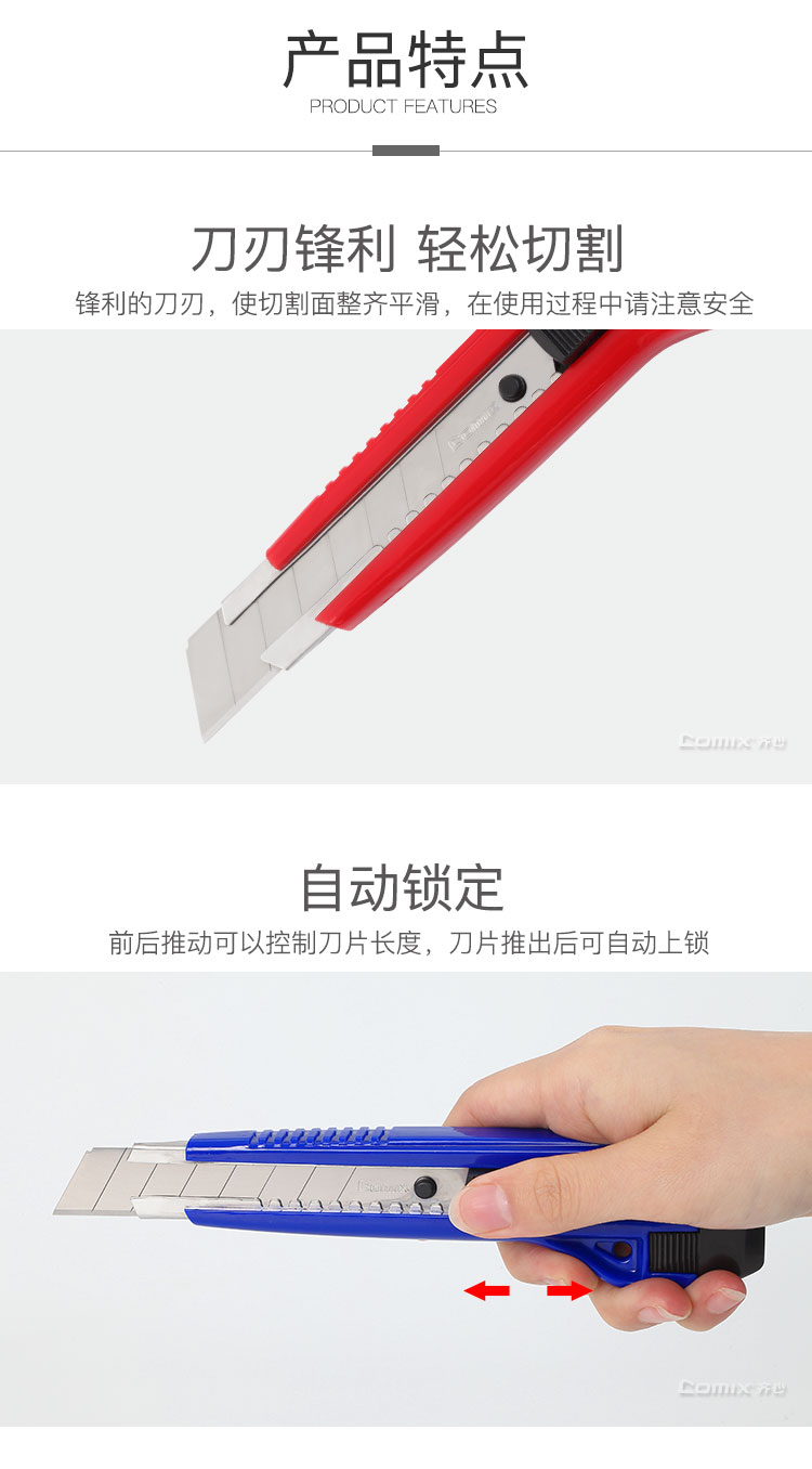 商品名称:齐心/Comix 美工刀 学生裁纸刀 办公文具墙纸刀介刀 大号18mm B2828 配色(颜色随机发) 一把