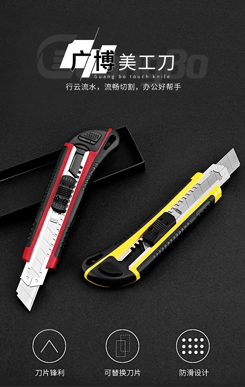 - 商品名称:广博(GuangBo)大号美工刀防滑裁纸刀壁纸刀内含3片刀片 办公用品 颜色随机 MG5435