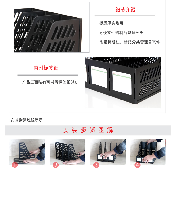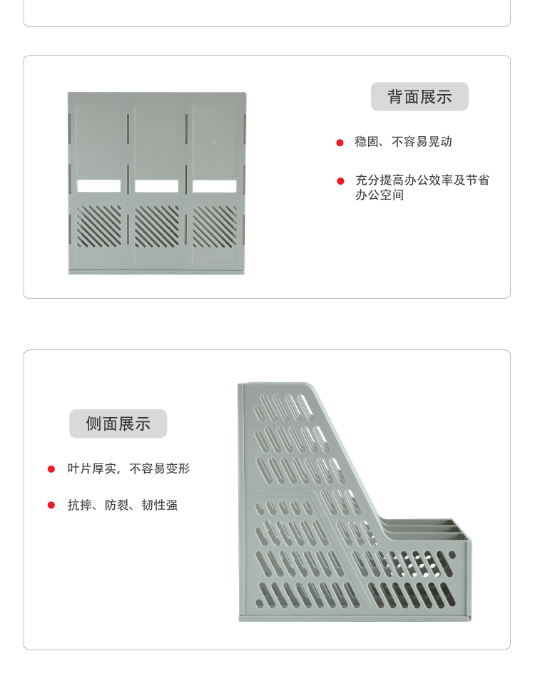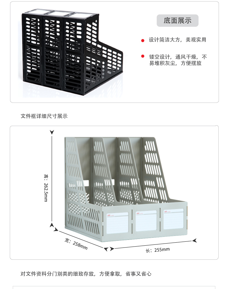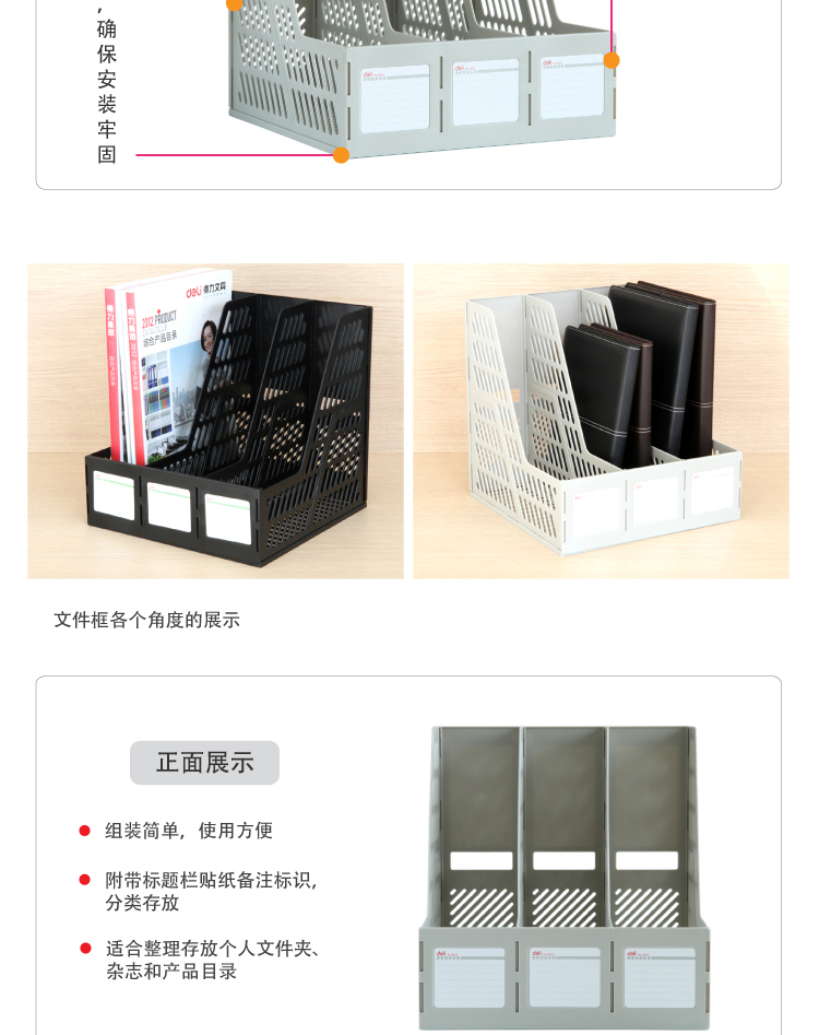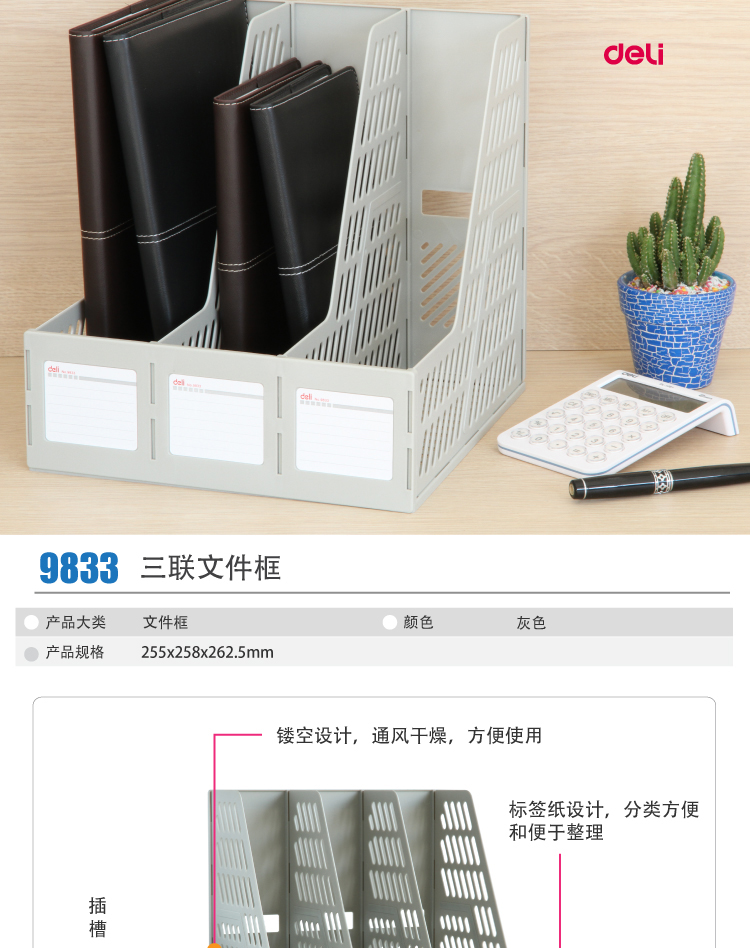 - 商品名称:得力(deli)三联镂空桌面文件框 三栏带标签稳固文件栏/文件筐/资料框 灰白色9833