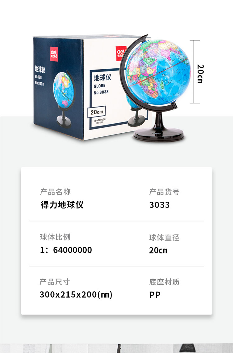 - 商品名称:得力(deli)Ф20cm学生办公地球仪 教学研究摆件 教学用品 3033