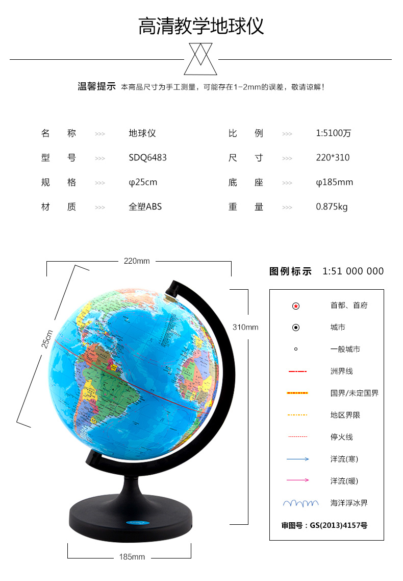 商品名称:广博(GuangBo)Ф25cm旋转地球仪办公文具/学习用品DQ6483