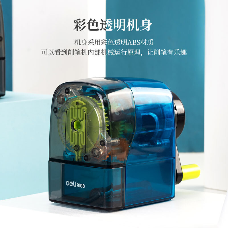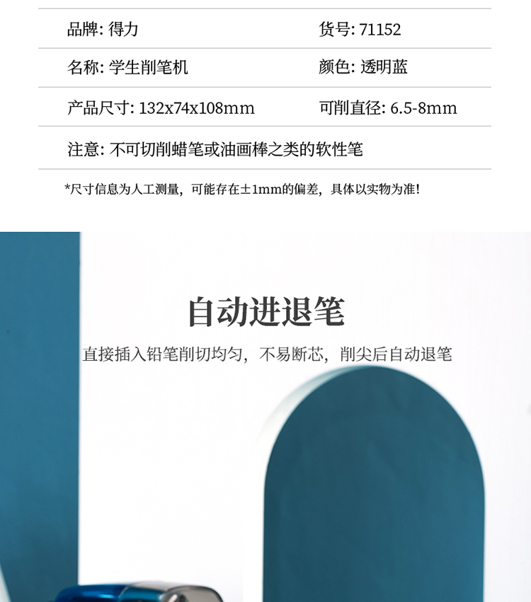 - 商品名称:得力(deli)自动进笔卷笔刀 自动排断芯学生转笔刀 多动能铅笔彩铅两用铅笔刀 透明蓝 71152