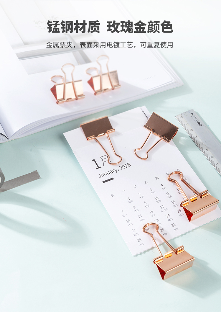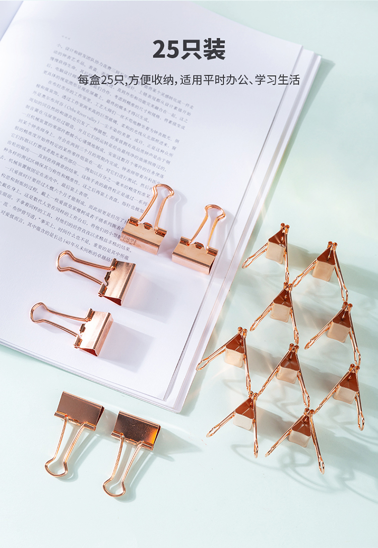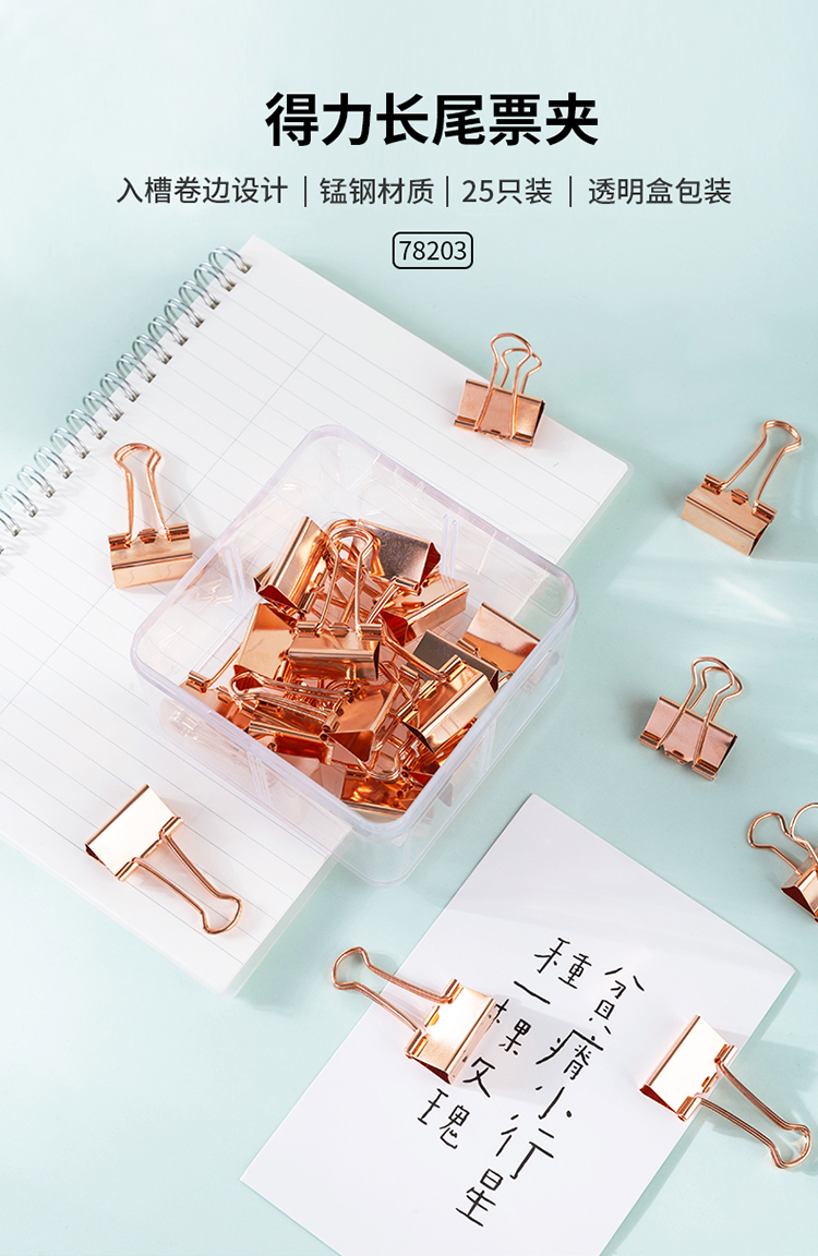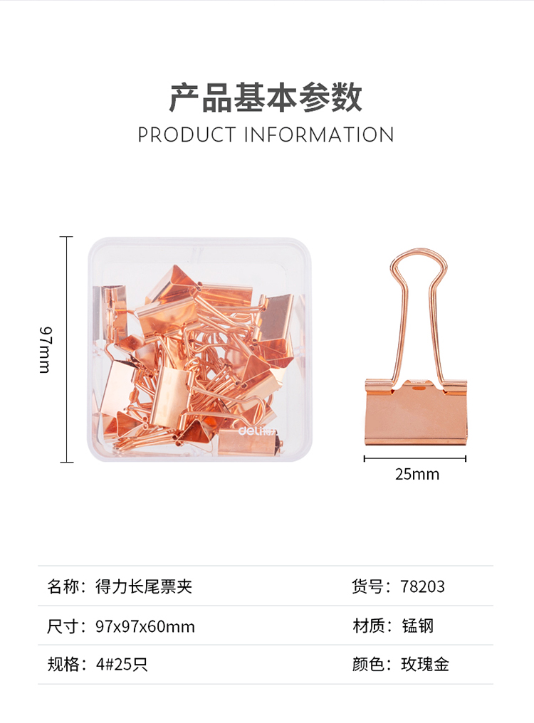 - 商品名称:得力(deli)25只25mm长尾夹票夹 4#金属燕尾夹票据夹子 玫瑰金78203