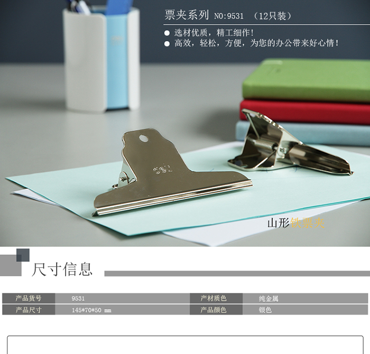 - 商品名称:得力(deli)12只145mm大号山形票据票夹画板夹 财务票据夹票据夹子 办公用品 9531