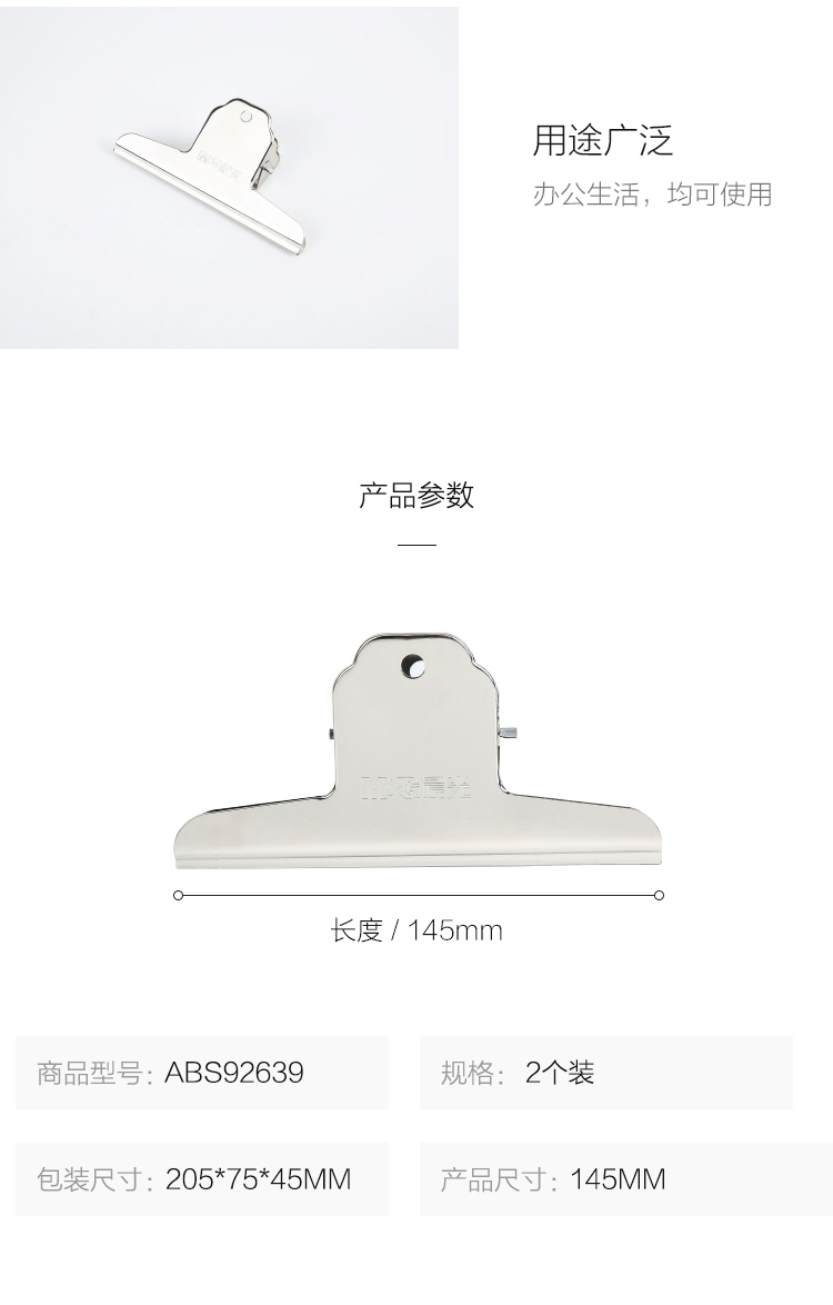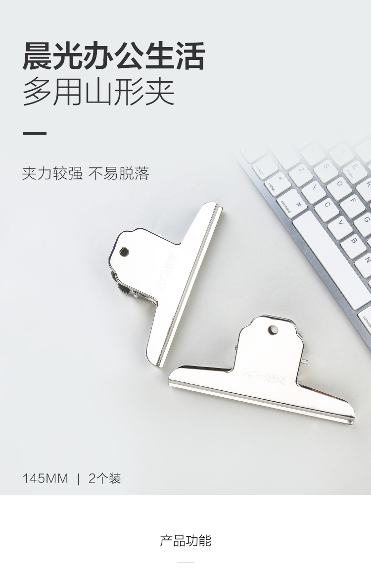 - 商品名称:晨光(M&G)文具145mm山形票夹 办公金属财务票据夹 不锈钢夹子画板夹 2个装ABS92639