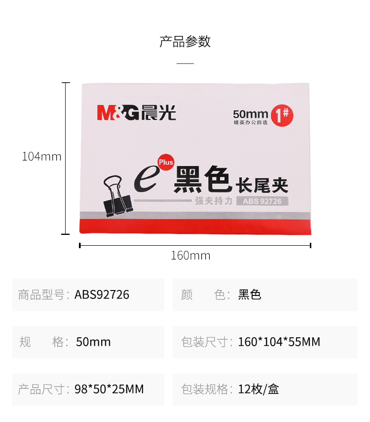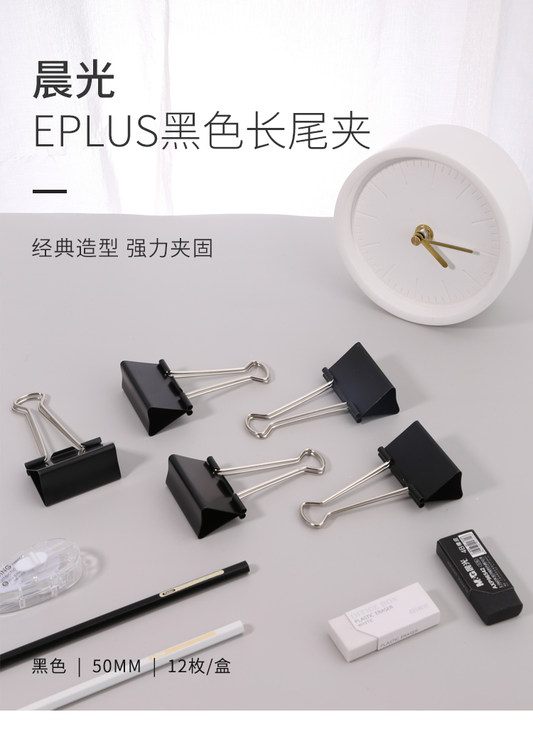 - 商品名称:晨光(M&G)文具50mm黑色长尾夹 金属票据夹 Eplus系列办公燕尾夹 12个/盒ABS92726