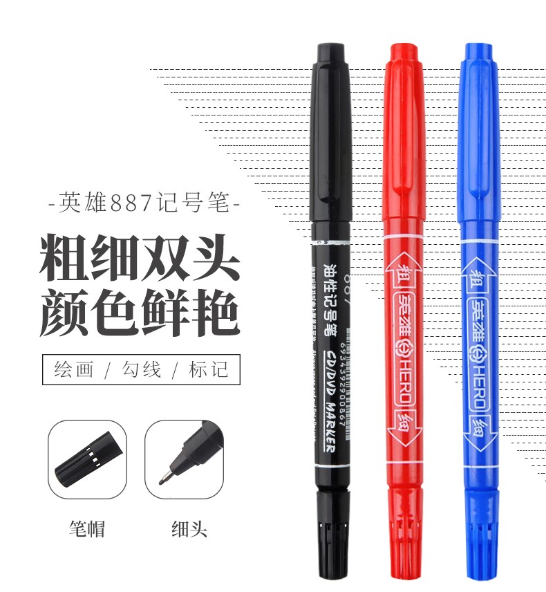 英雄(HERO)彩色双头/黑色双头油性记号笔887(小头) 10支-蓝色