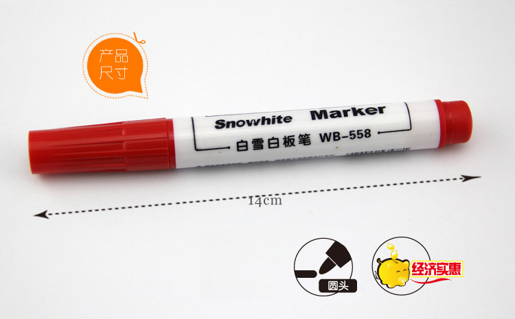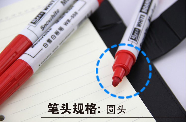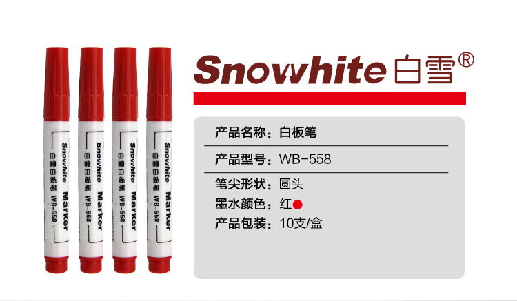 商品名称:白雪(snowhite)WB-558单头红色白板笔可擦易擦办公记号笔会议笔10支/盒