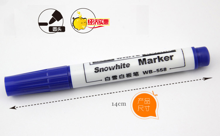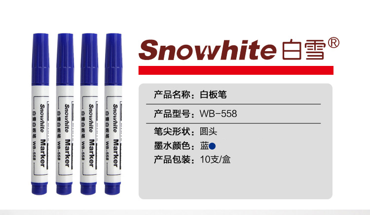 商品名称:白雪(snowhite)WB-558 单头蓝色白板笔可擦易擦办公记号笔会议笔10支/盒