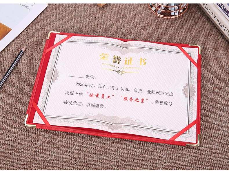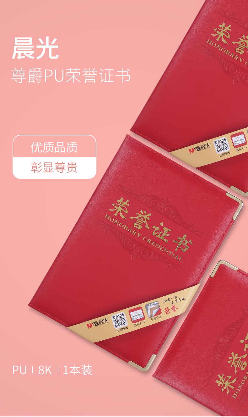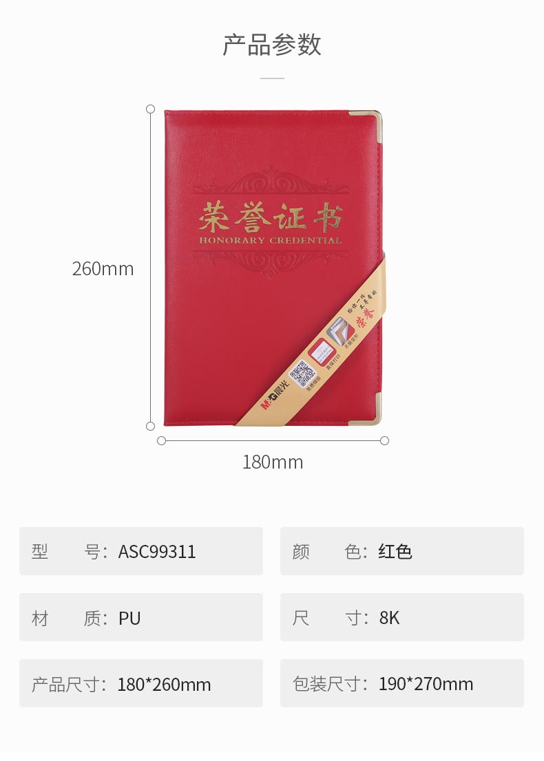 - 商品名称:晨光(M&G)文具8K红色PU荣誉证书 180*260mm烫金竖式证书 尊爵系列学校/企业褒奖证书 单本装ASC99311
