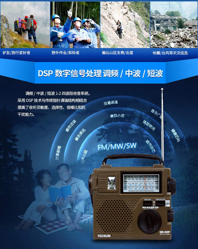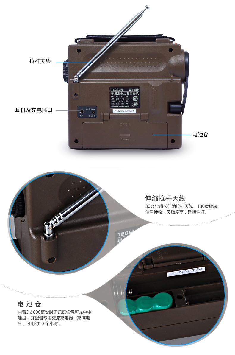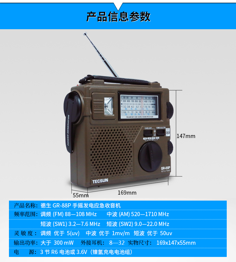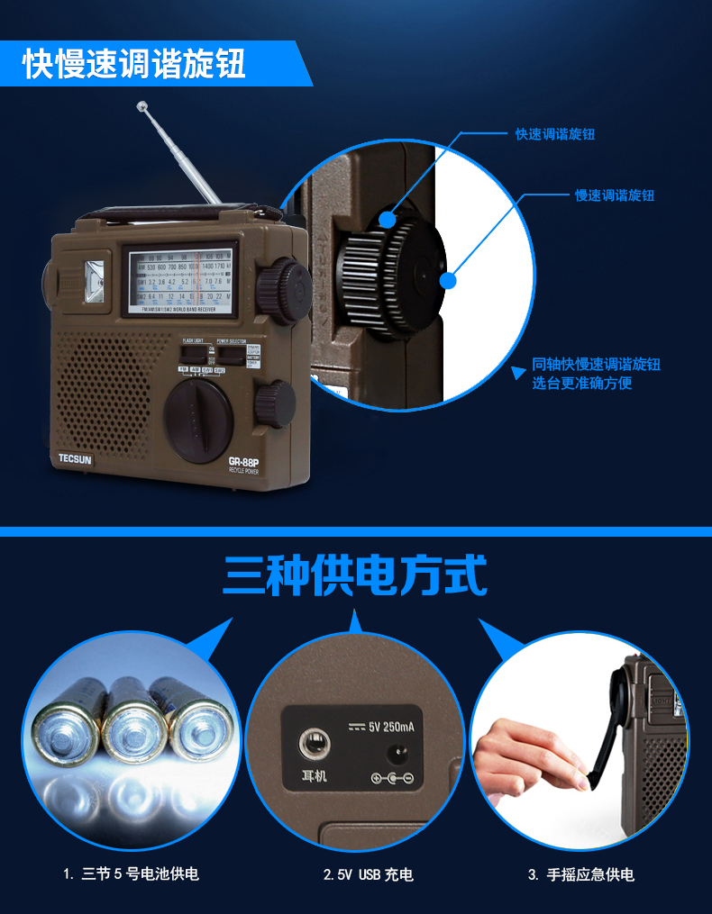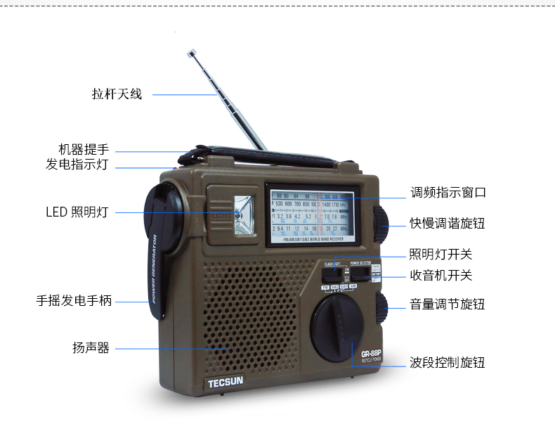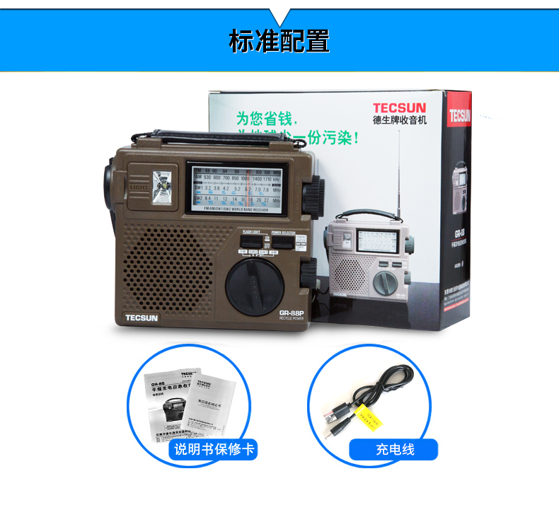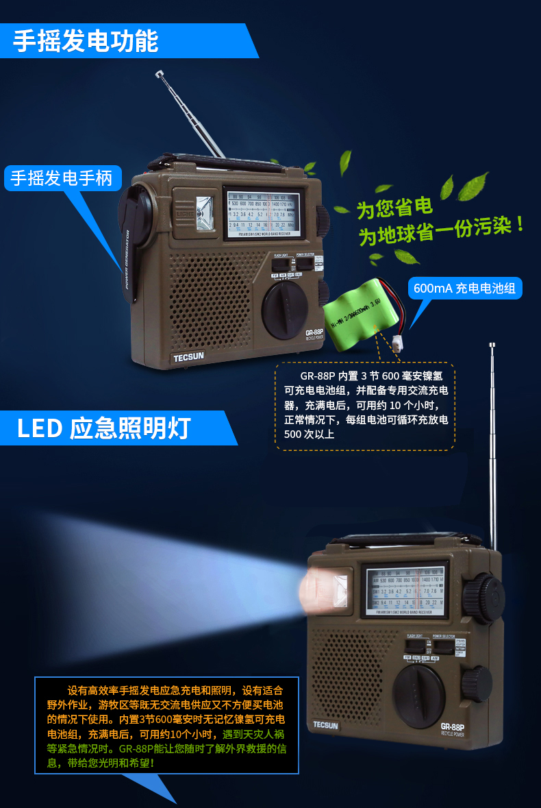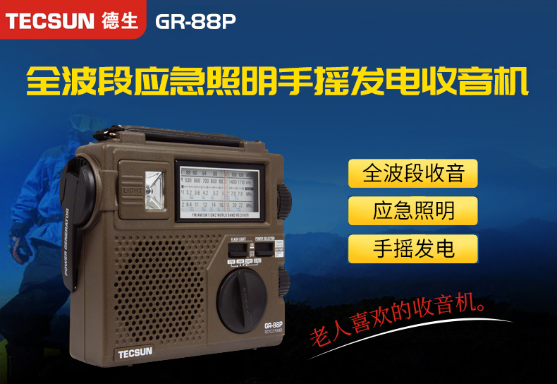 - 商品名称:德生(Tecsun)GR-88P收音机 音响 老年人全波段 充电收音机 照明 手摇发电收音机 便携式 户外应急收音机