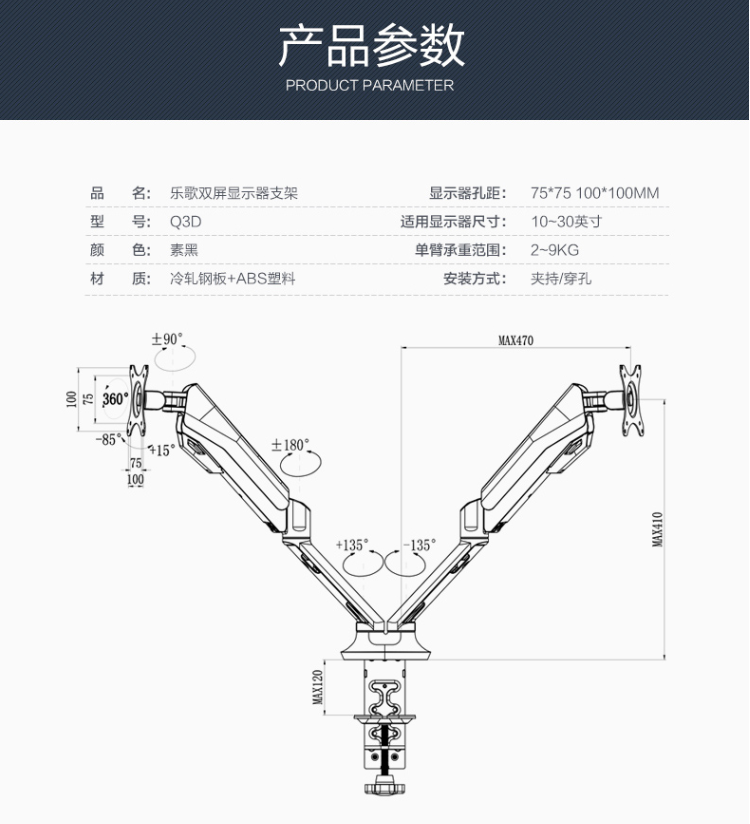 - 商品名称:乐歌(Loctek)Q3D 显示器支架 双屏拼接显示器设计电脑架 桌面底座旋转升降双屏支架