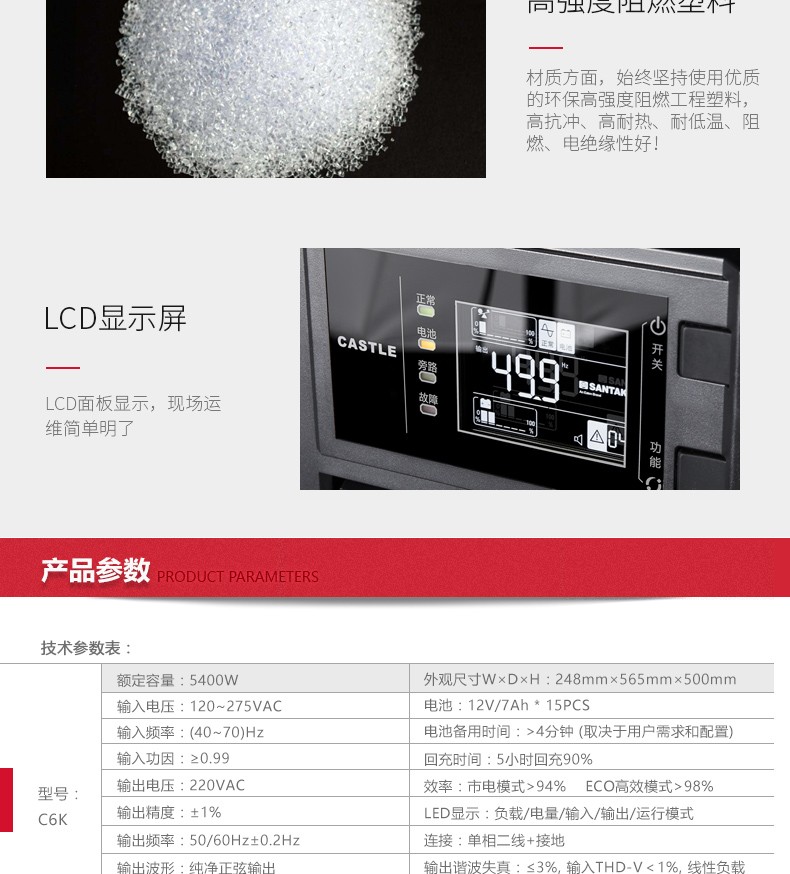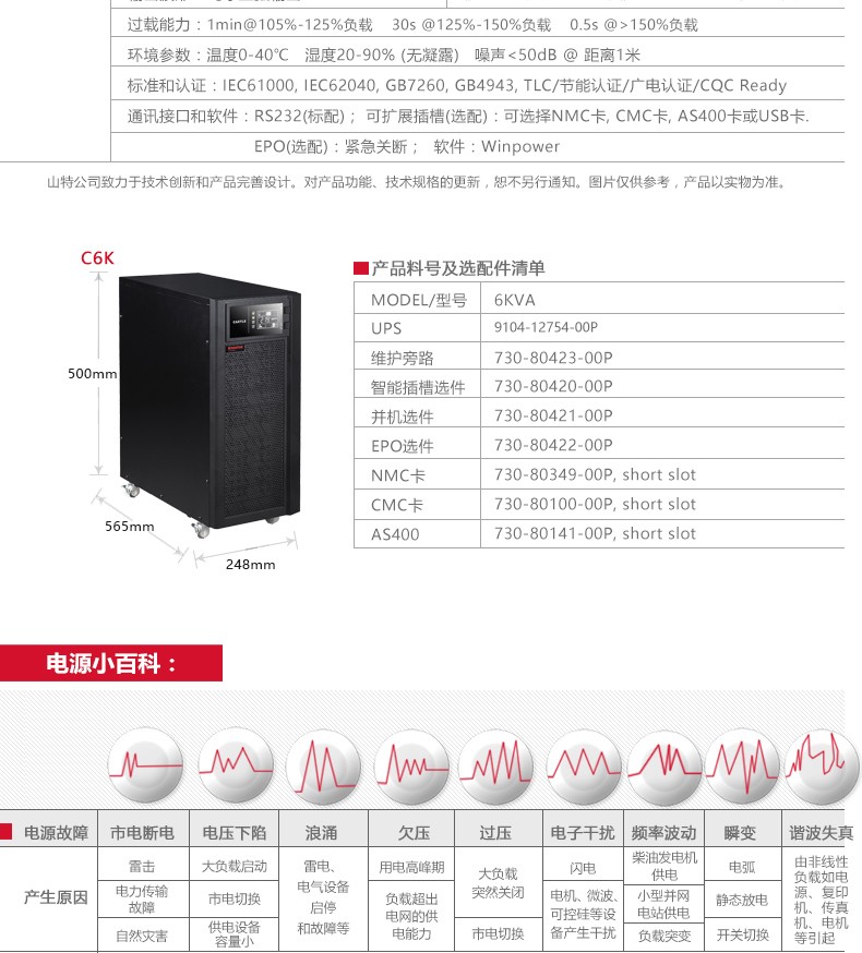 - 商品名称:山特(SANTAK)C6K 在线式UPS不间断电源 稳压服务器机房电脑停电后备电源 6KVA/5400W内置电池标准机