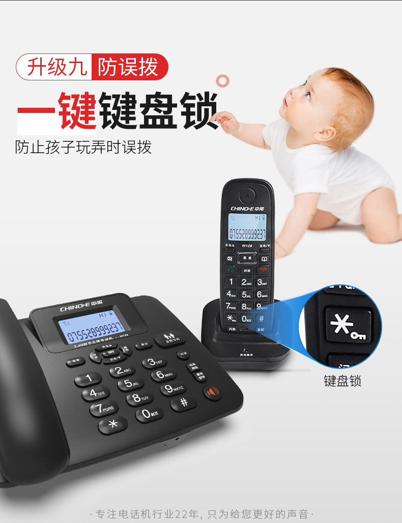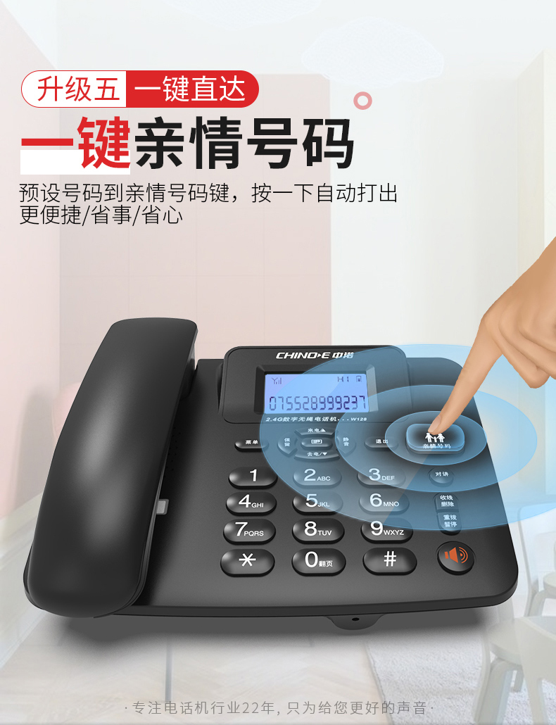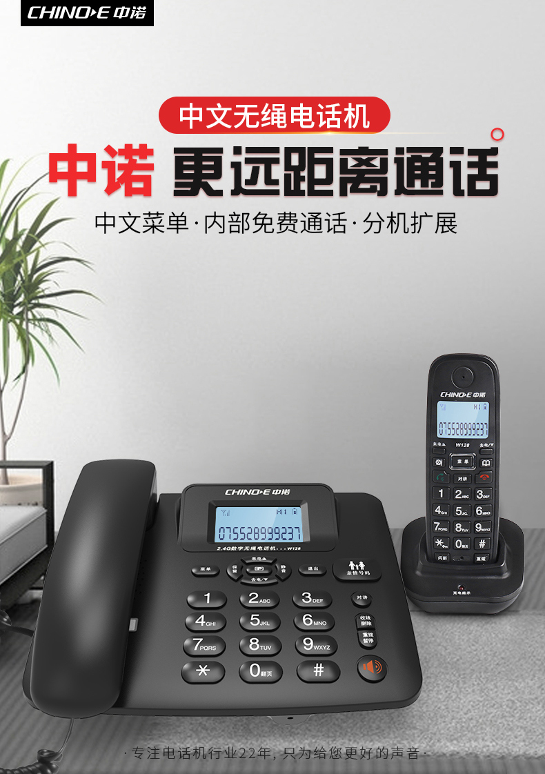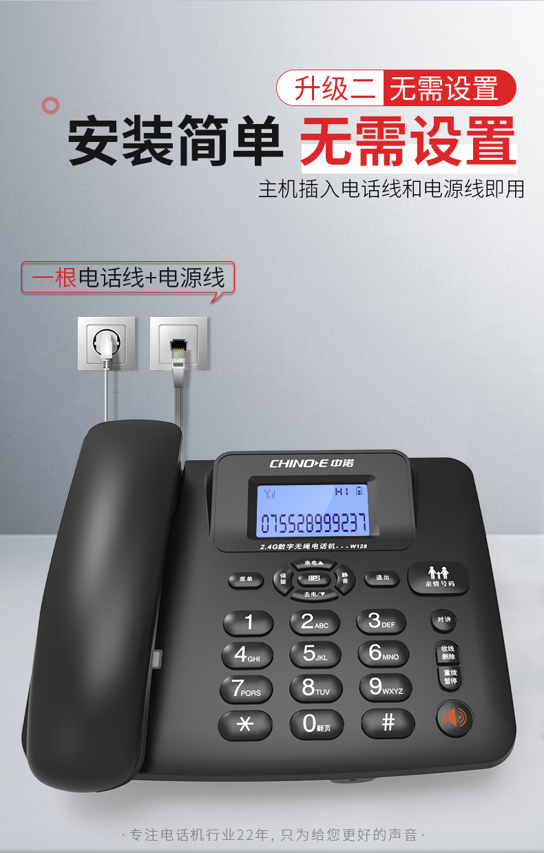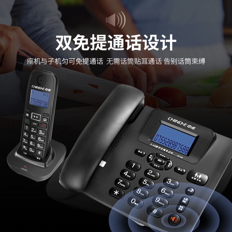 中诺 数字 无绳 电话机 无线 座机 子母机 一拖一 套装 内线通话 一键拨号 固定 电话 W128黑色