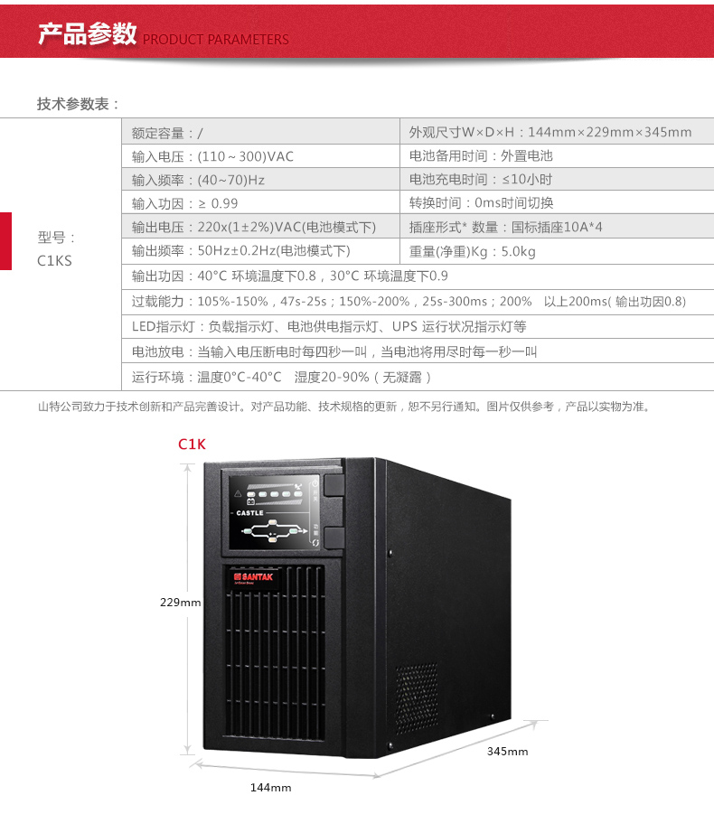 - 商品名称:山特(SANTAK)C1KS C1KS 在线式外接电池长效机1KVA/800W单主机 (不含电池)