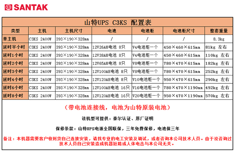 - 商品名称:山特(SANTAK)C3KS 在线式UPS不间断电源外接电池长效机3KVA/2400W单主机 (不含电池)