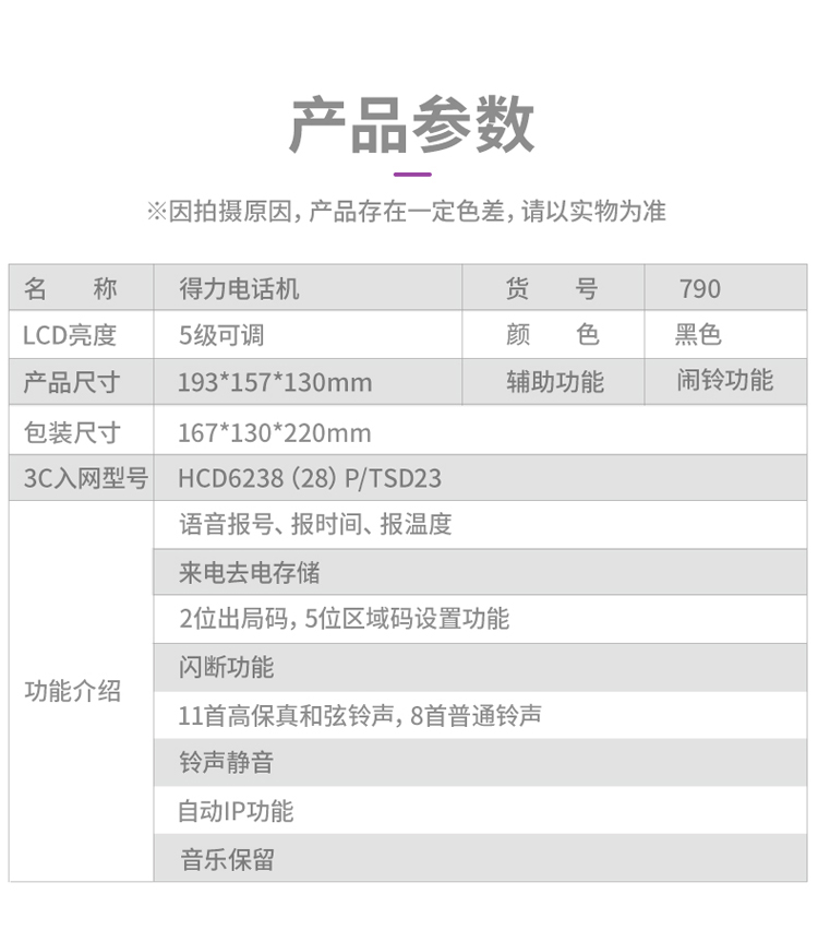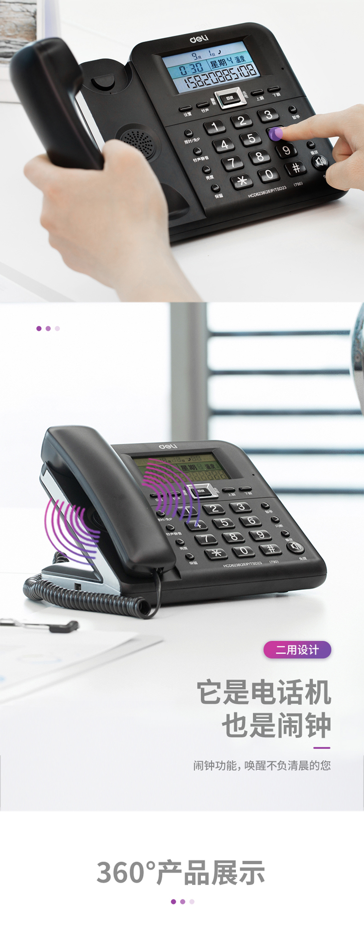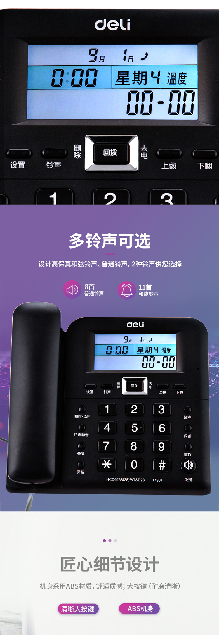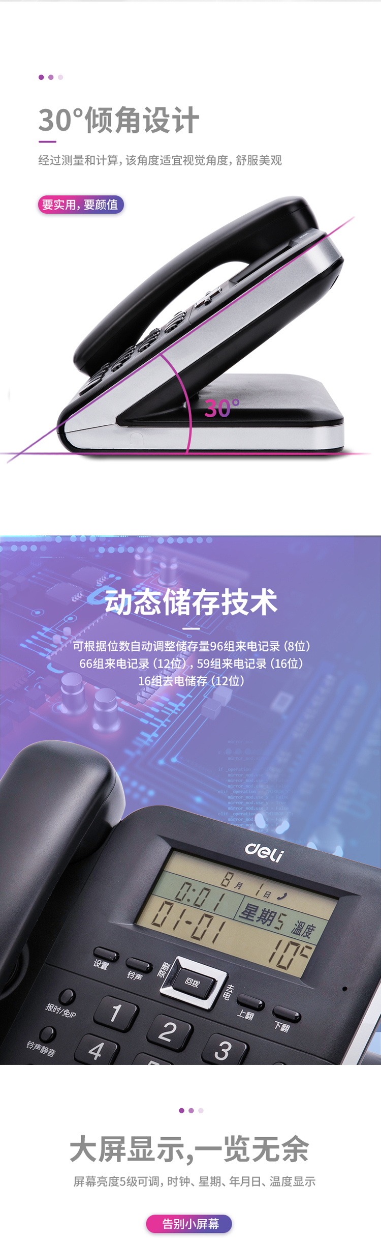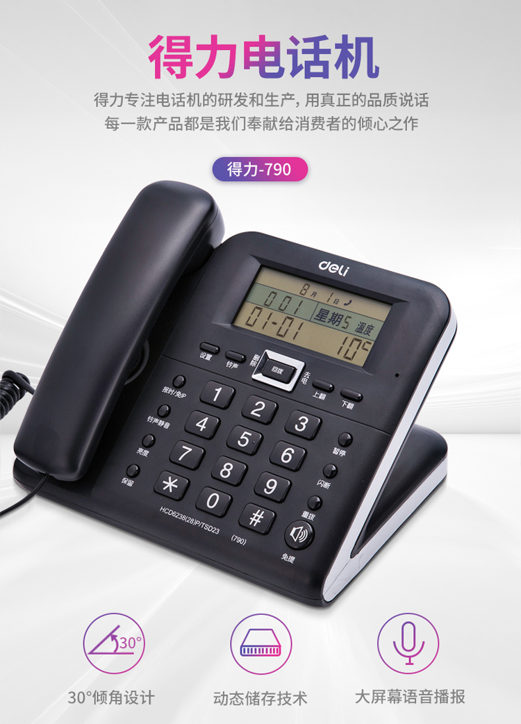 - 商品名称:得力(deli)电话机座机 固定电话 办公家用 30°倾角铃声选择 790黑