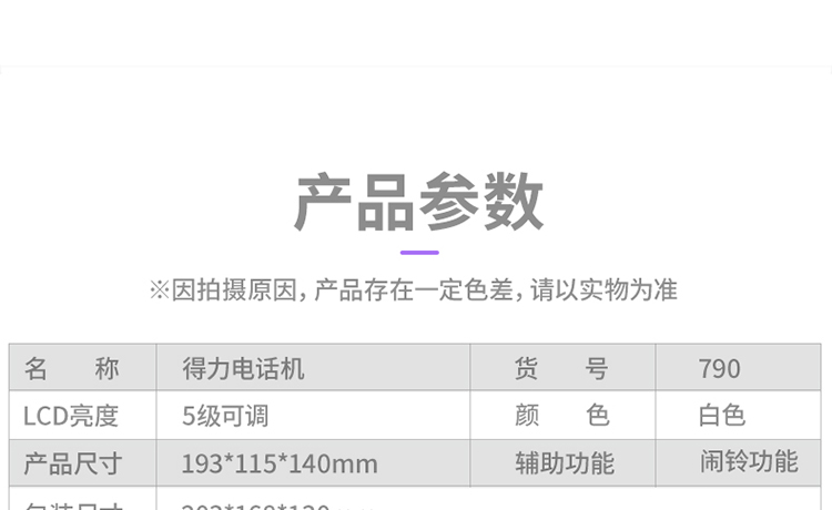 商品名称:得力(deli) 电话机座机 固定电话 办公家用 30°倾角温度显示 790白