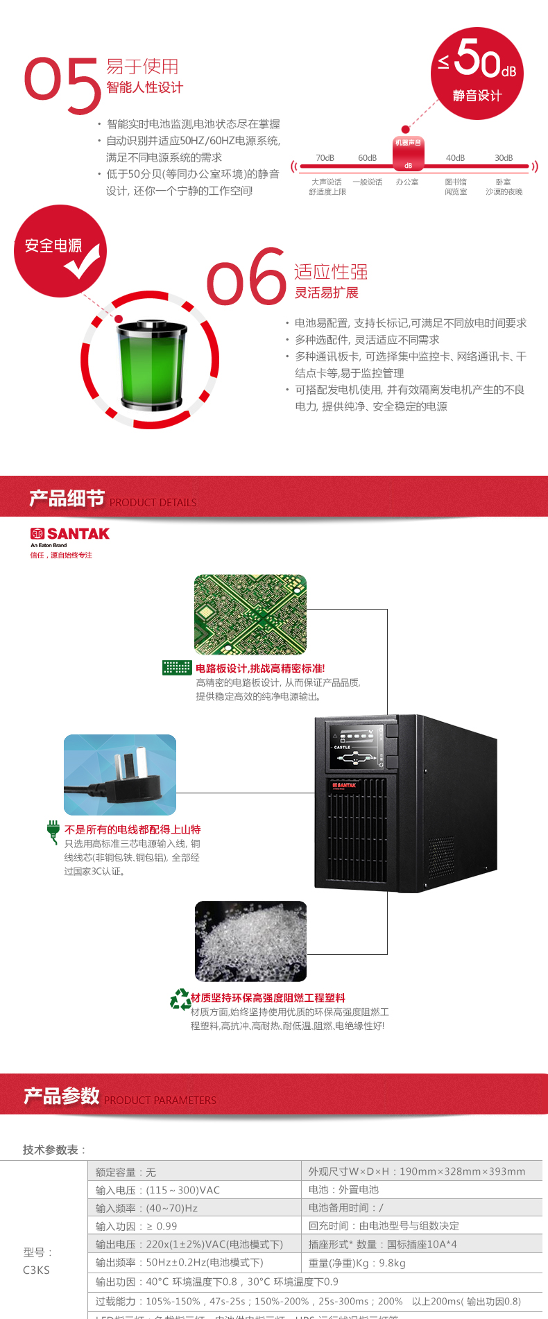 - 商品名称:山特(SANTAK)C3KS 3000VA/2400W在线式UPS不间断电源外接电池长效机 满载2400W供电8小时