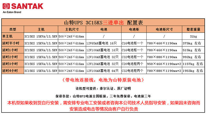 - 商品名称:山特(SANTAK)3C15KS 三进单出在线式UPS不间断电源外接电池长效机 15KVA/13.5KW停电续航30分钟