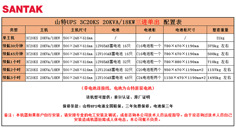 - 商品名称:山特(SANTAK)3C20KS 三进单出在线式UPS不间断电源外接电池长效机 20KVA/18KW停电续航45分钟
