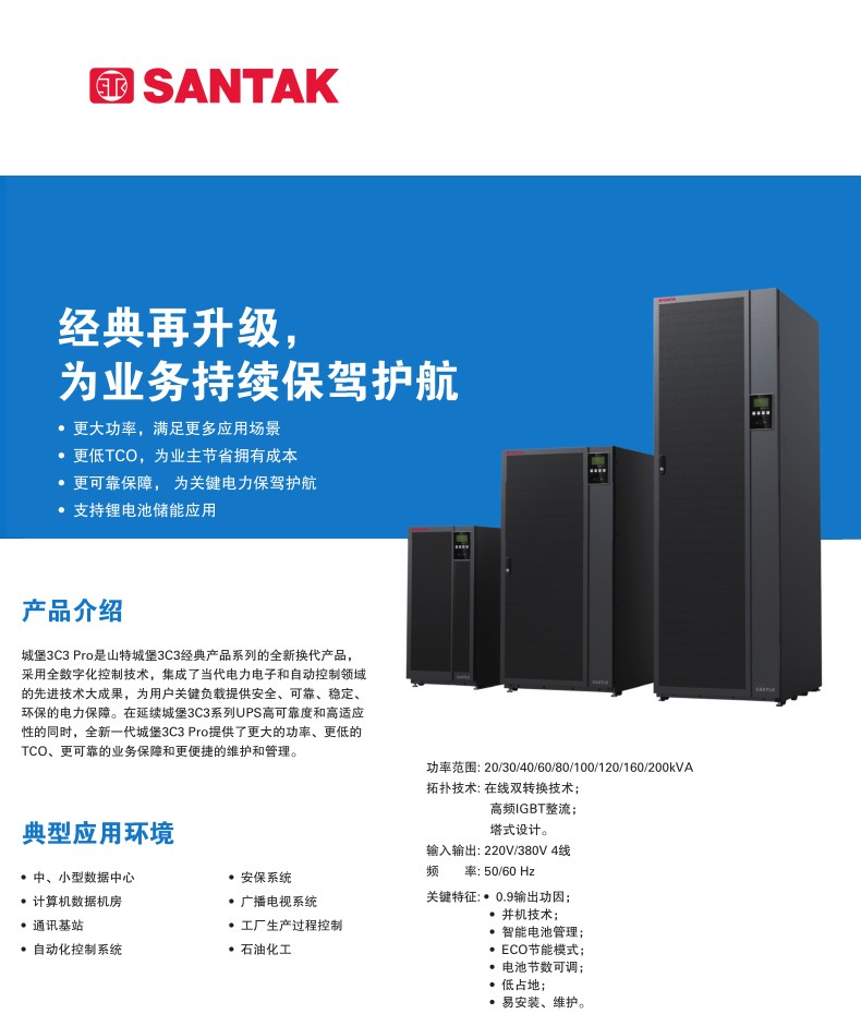 商品名称:山特(SANTAK)3C3 Pro 20KS 三进三出在线式UPS不间断电源20KVA/18KW单主机 (不含电池)