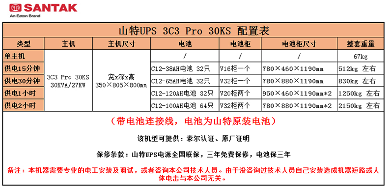 - 商品名称:山特(SANTAK)3C3 Pro 30KS 三进三出在线式UPS不间断电源30KVA/27KW 供电30分钟左右