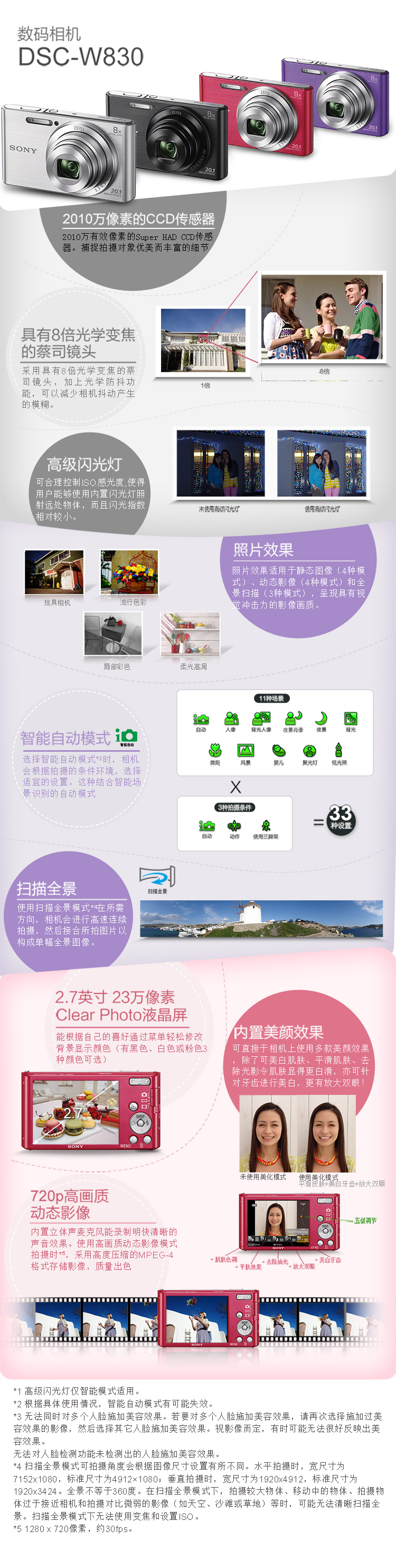 索尼(SONY) DSC-W830 便携数码相机/照相机/卡片机 紫色(约2010万有效像素 8倍光学变焦 25mm广角 )