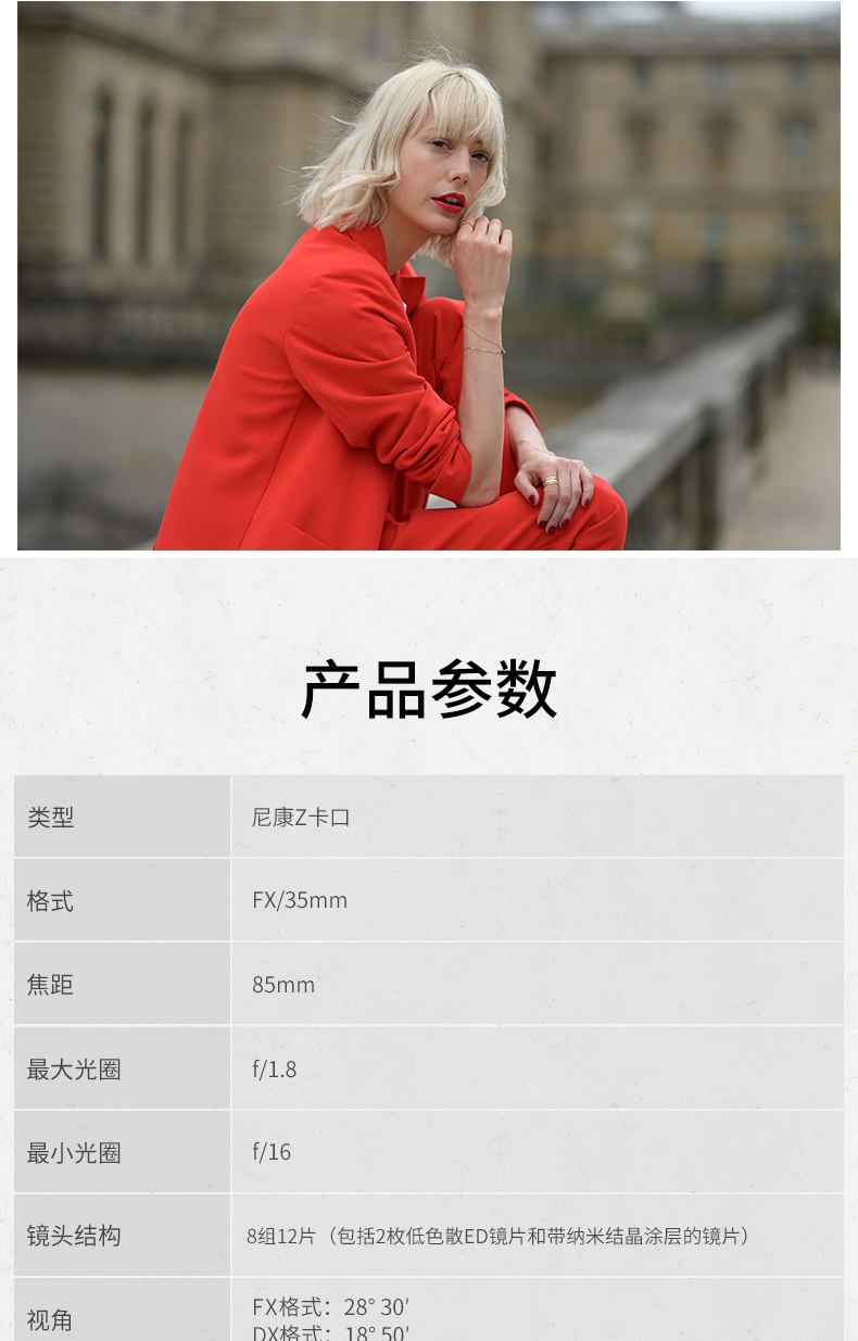 - 型号:尼克尔 Z 85mm f/1.8 S