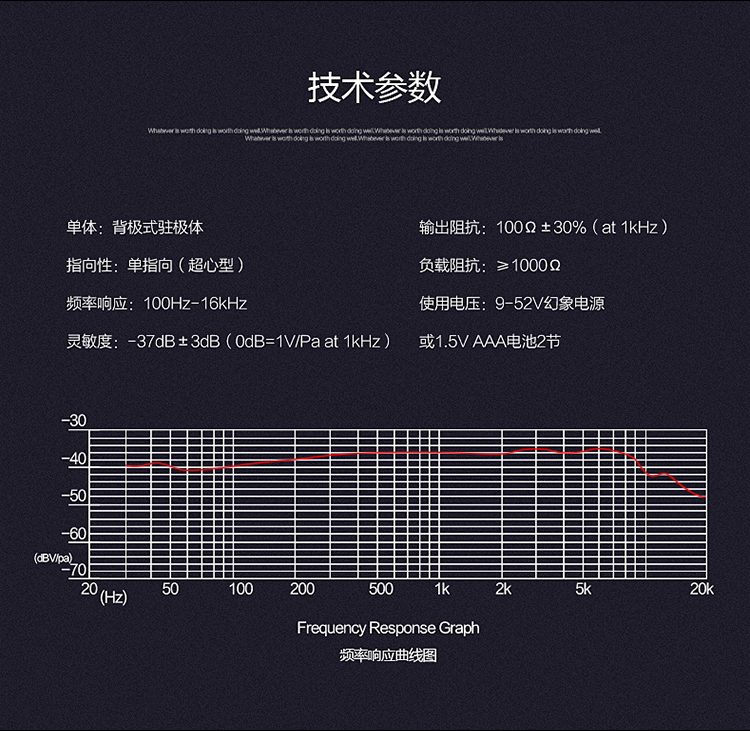 - 灵敏度:-33dB±3dB(0dB=1V/Pa at 1kHz)