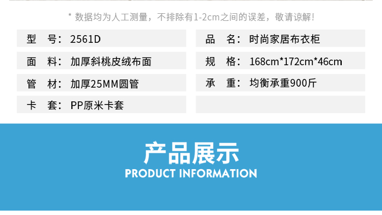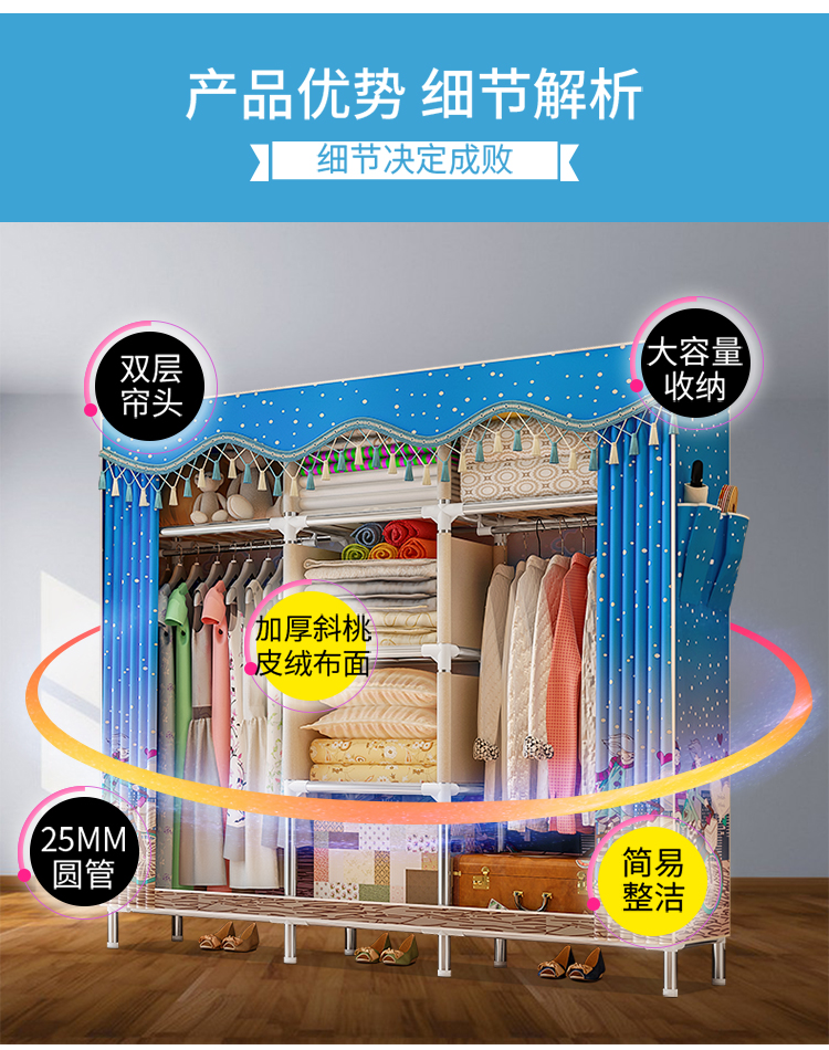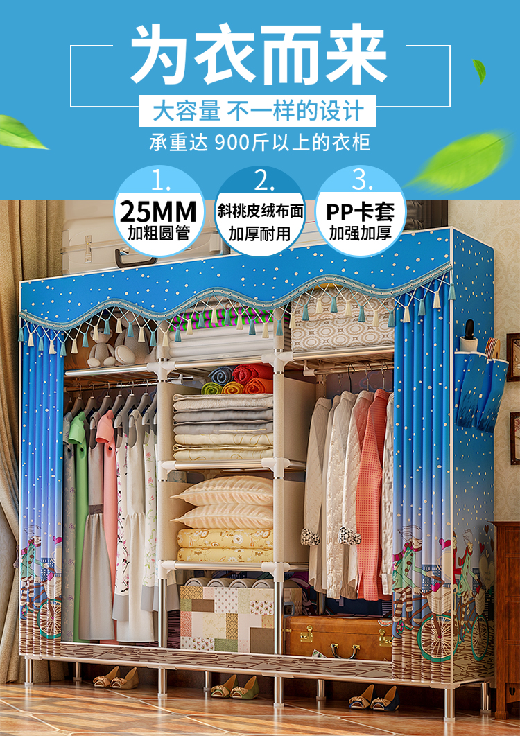- 商品名称:蜗家布衣柜加粗25管卧室简易衣柜双人加厚家用宿舍出租房布艺衣橱组装收纳柜子衣服柜2561