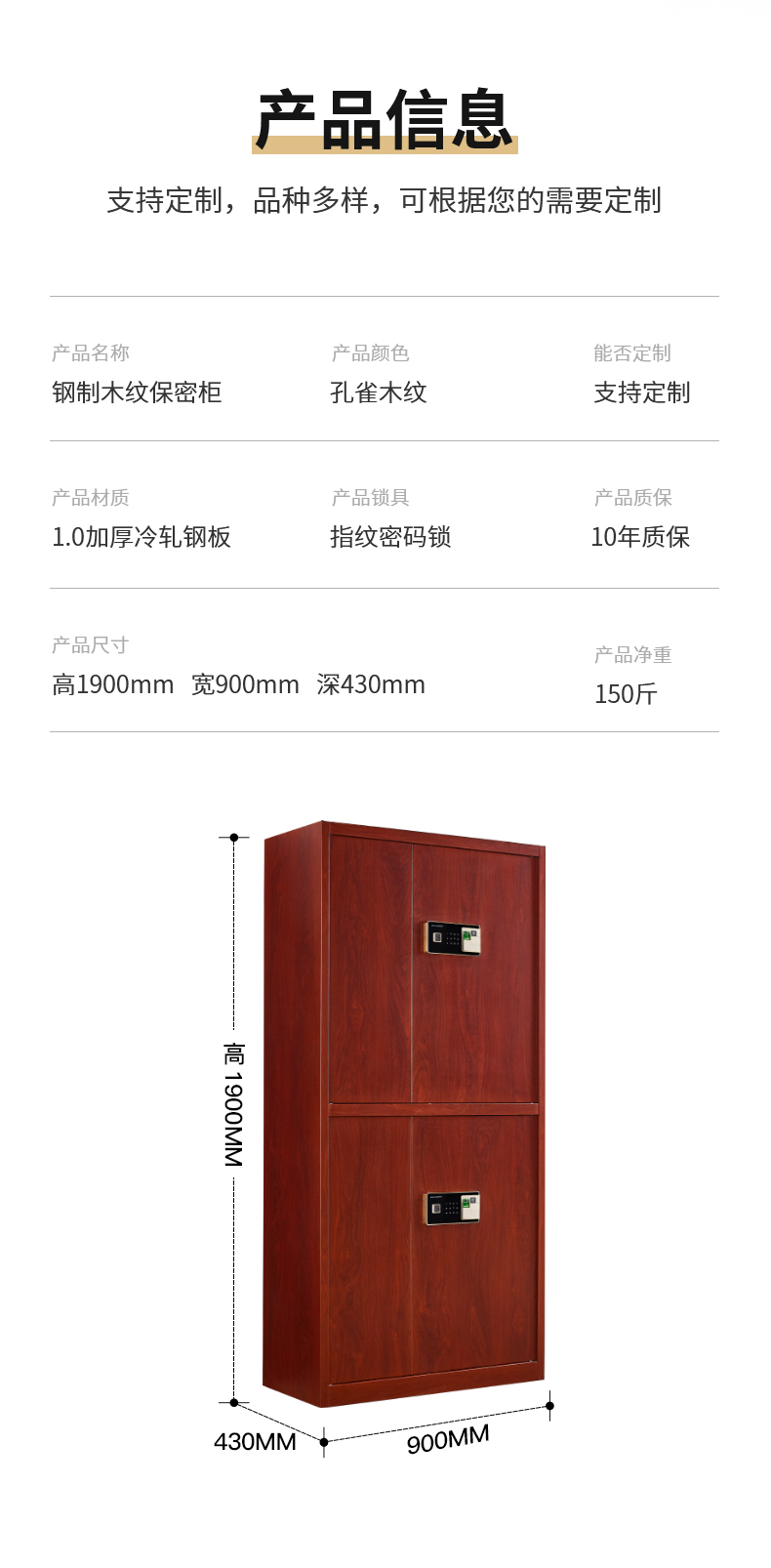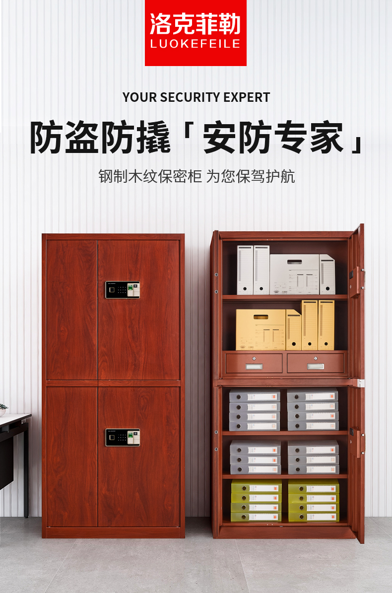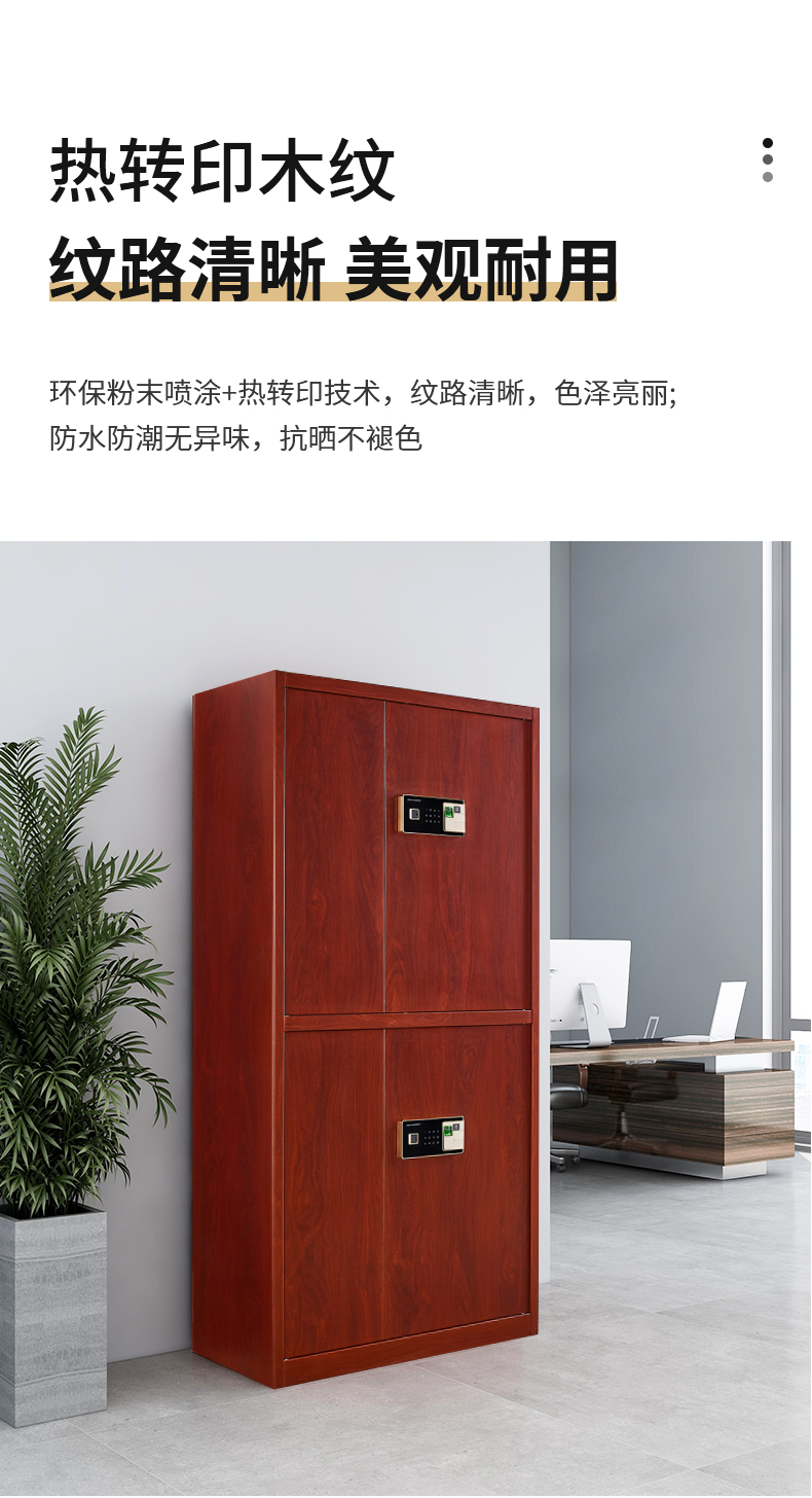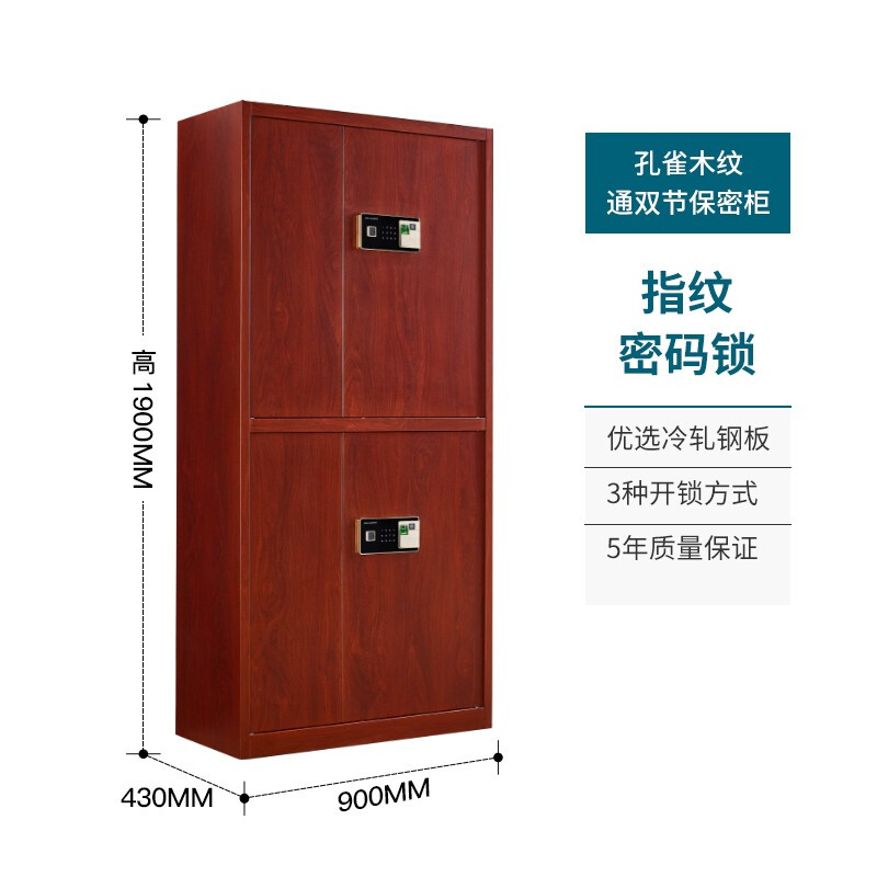 商品名称:洛克菲勒仿木纹指纹锁通双节保密柜钢制办公指纹电子密码锁文件柜高1900宽900深430
