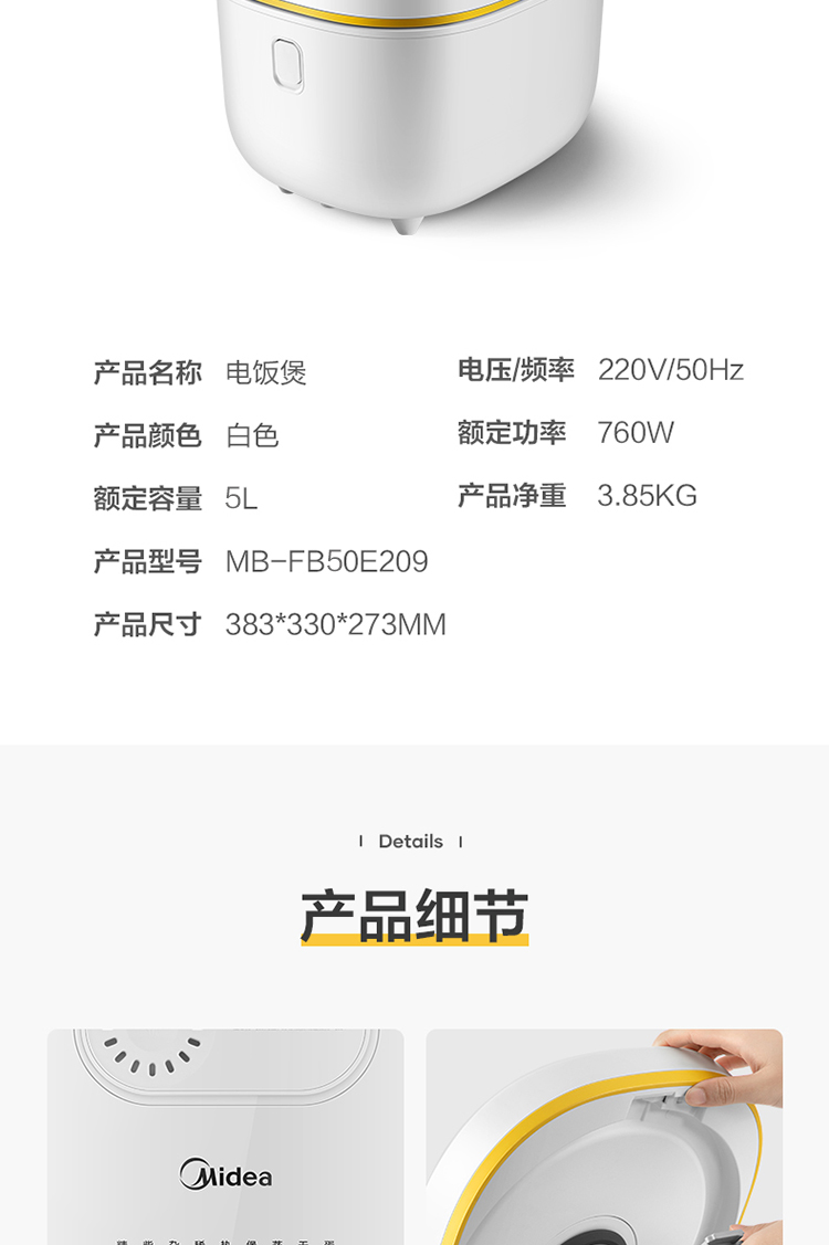 - 商品名称:美的(Midea)电饭煲家用5L智能加热电饭锅 智能预约多功能煮饭锅匠银圆釜灶MB-FB50E209