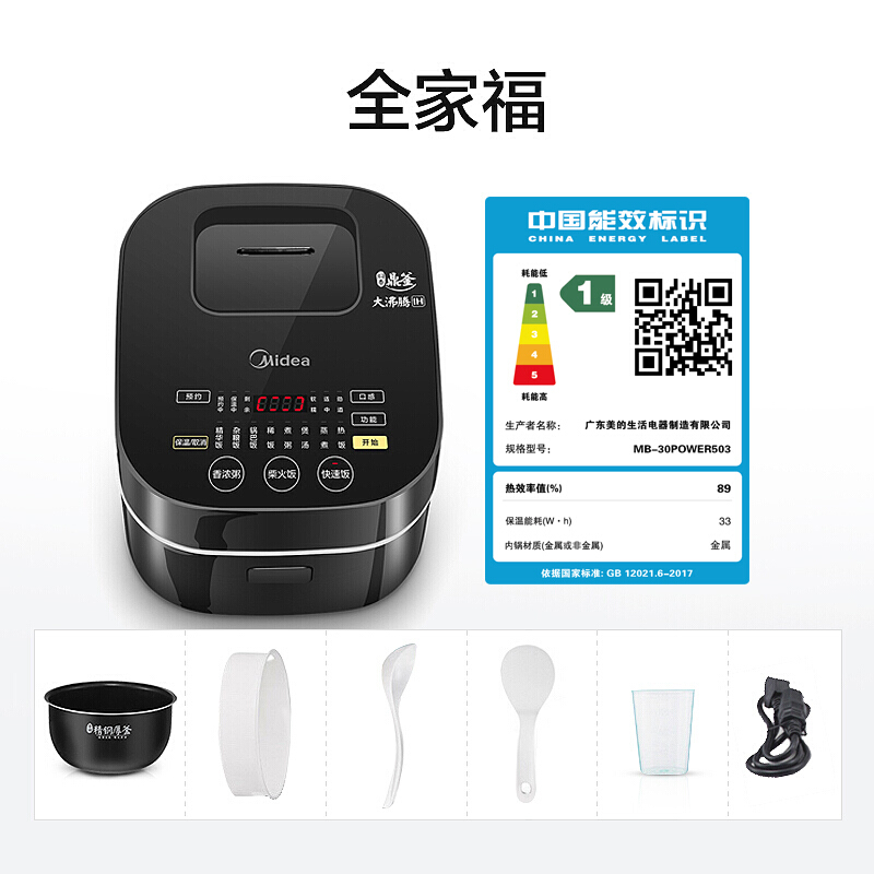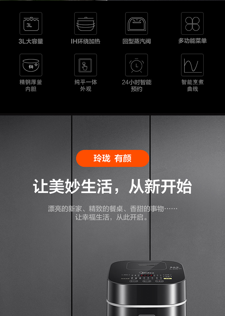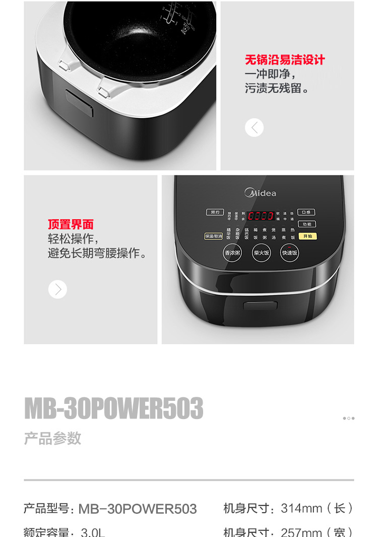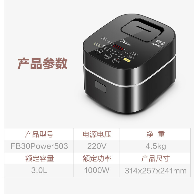 - 商品名称:美的(Midea)智能家电电饭煲电饭锅3L触摸操控IH电磁加热电饭煲一键香浓粥功能MB-FB30Power503