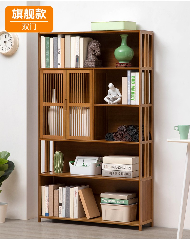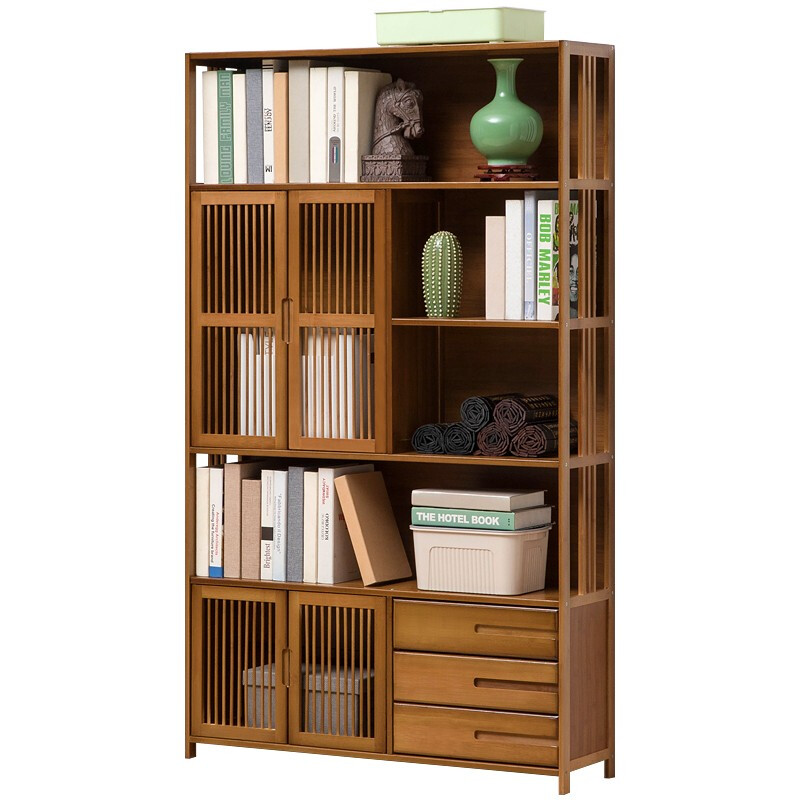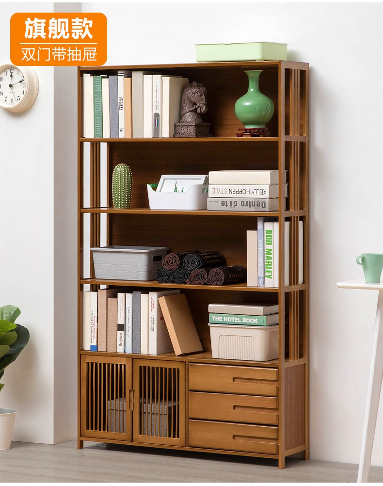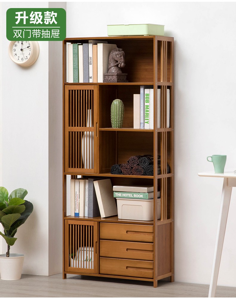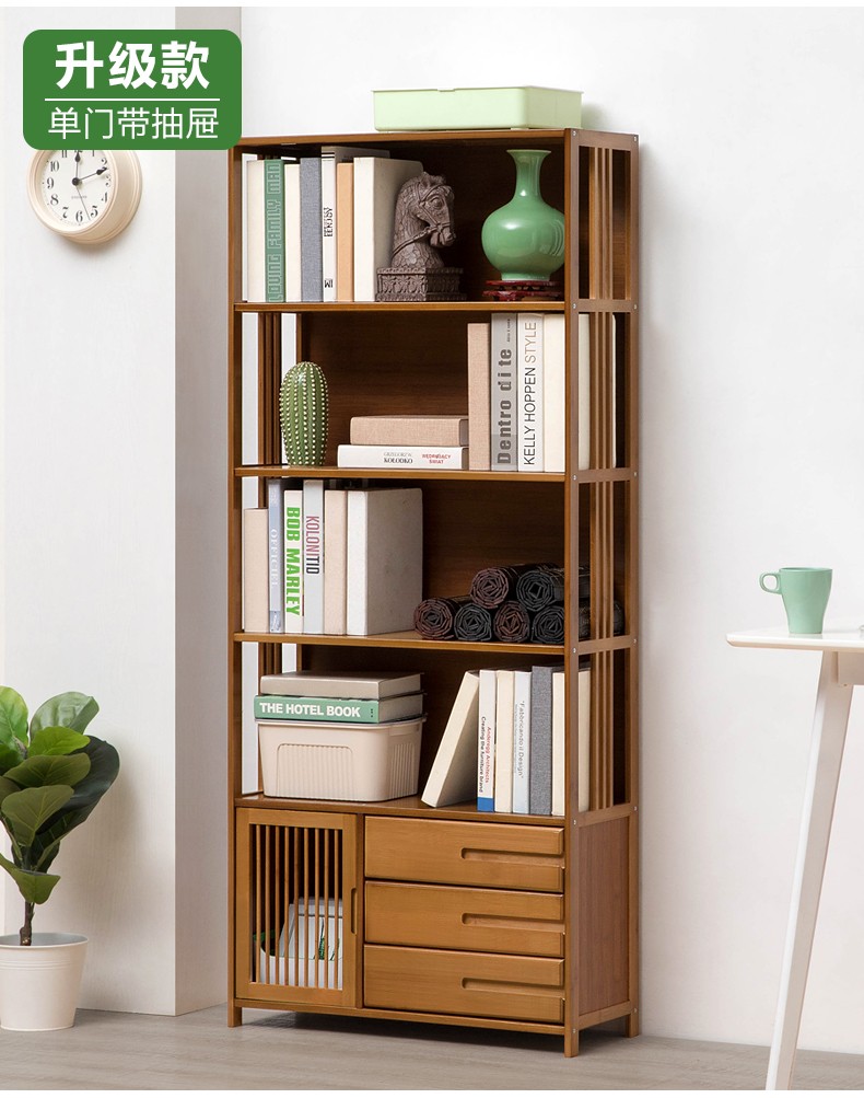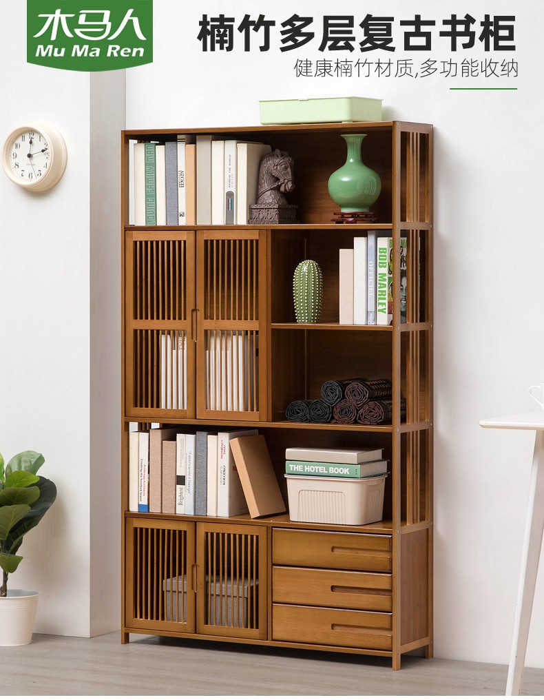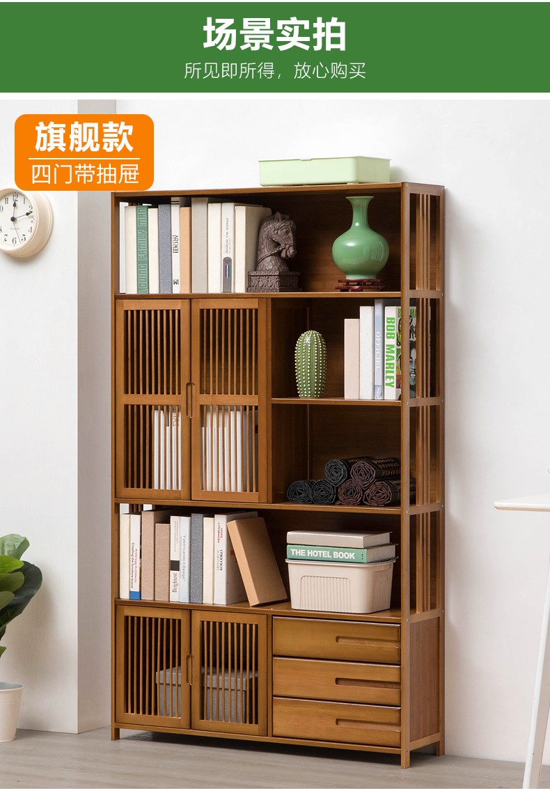 商品名称:木马人简易落地组合实木书架家用带门书橱学生带抽楠竹桌上小书柜收纳架创意储物柜简约办公柜子博古架置物架 【四门三抽屉】旗舰款(密封背板)