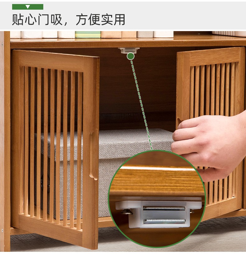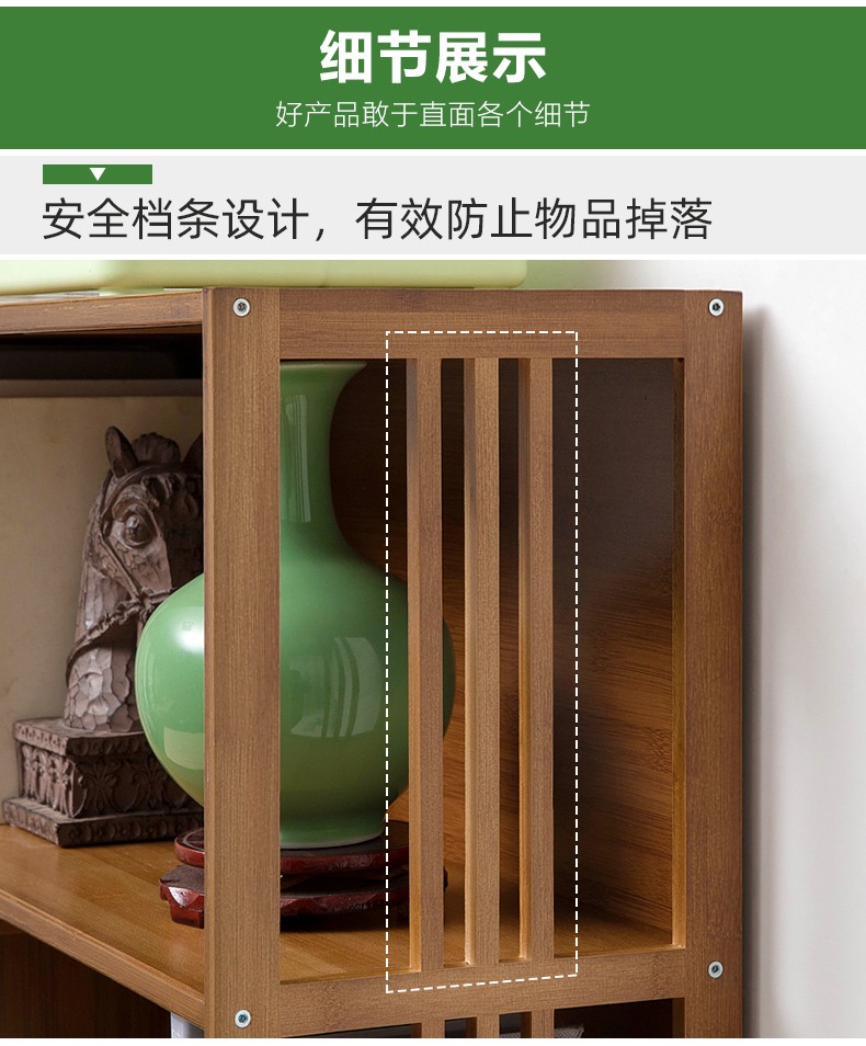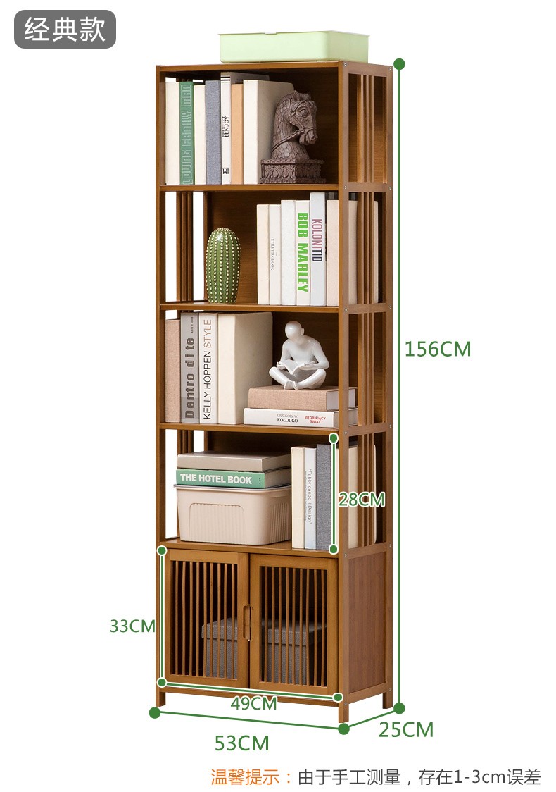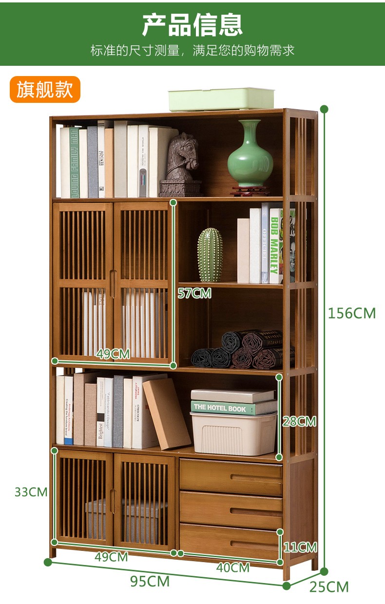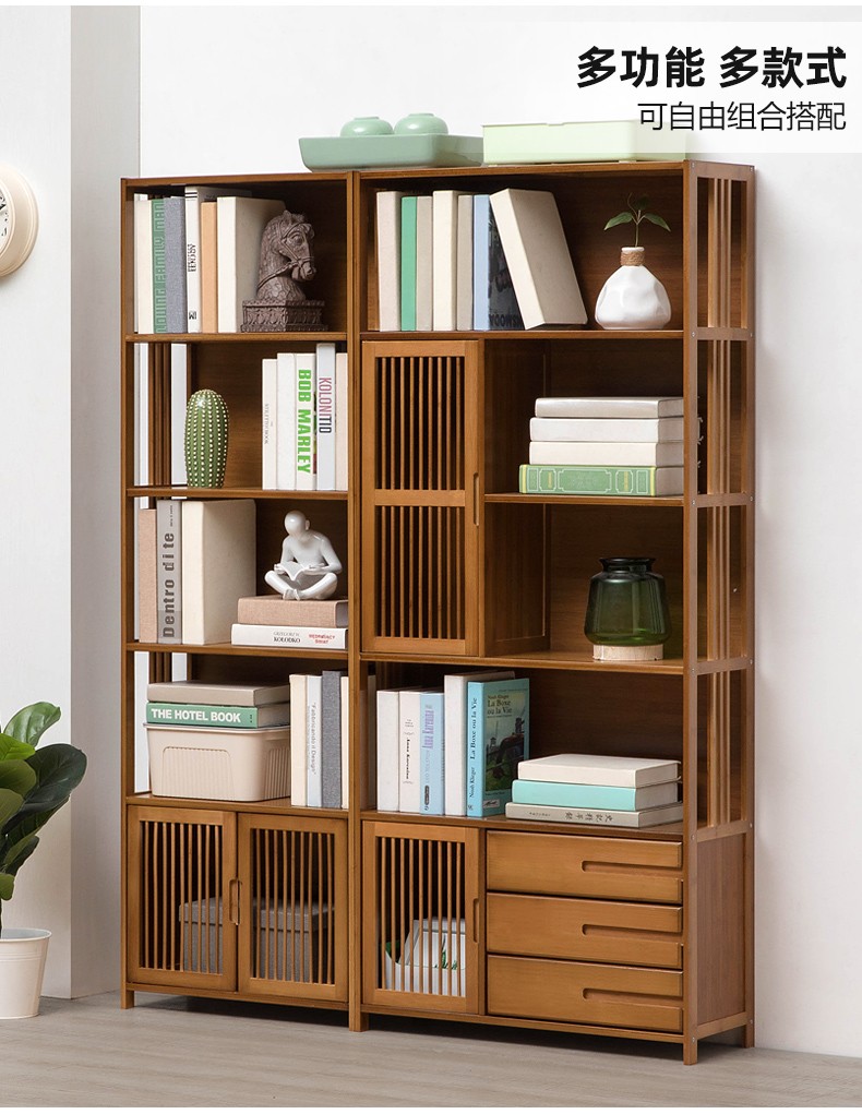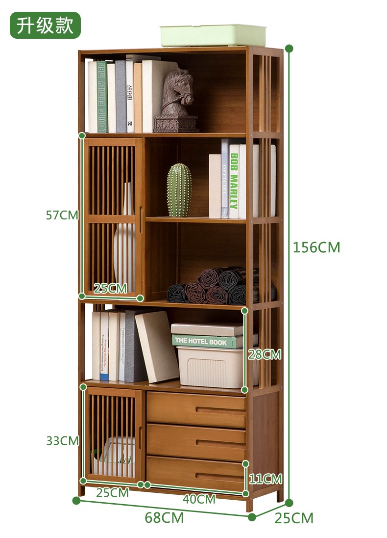商品名称:木马人简易落地组合实木书架家用带门书橱学生带抽楠竹桌上小书柜收纳架创意储物柜简约办公柜子博古架置物架 【四门三抽屉】旗舰款(密封背板)