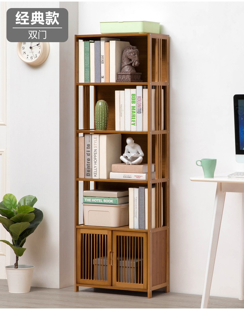 木马人简易落地组合实木书架家用带门书橱学生带抽楠竹桌上小书柜收纳架创意储物柜简约办公柜子博古架置物架 【四门三抽屉】旗舰款(密封背板)