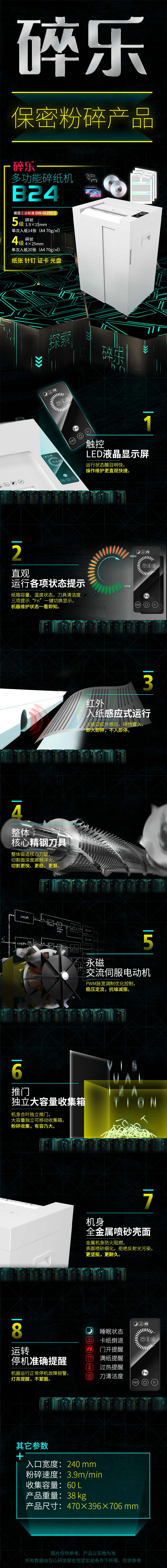 - 商品名称:碎乐(Ceiro)B24-5碎纸机德国5级保密可独立碎纸碎光盘碎PVC证卡等多功能交互式平板触摸控制 5级保密 1.9*15mm