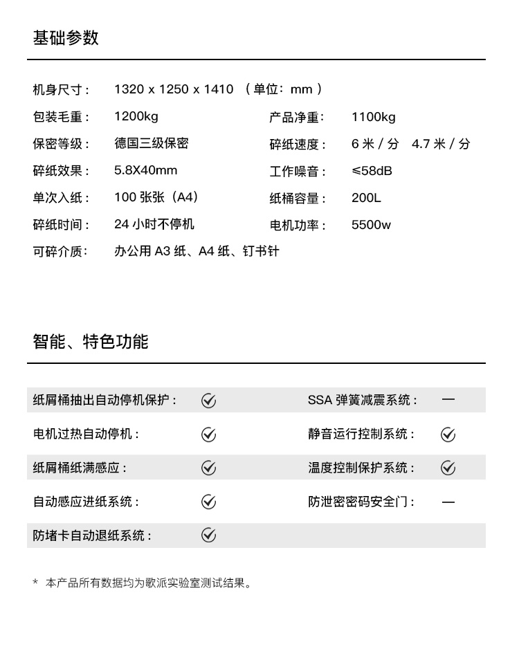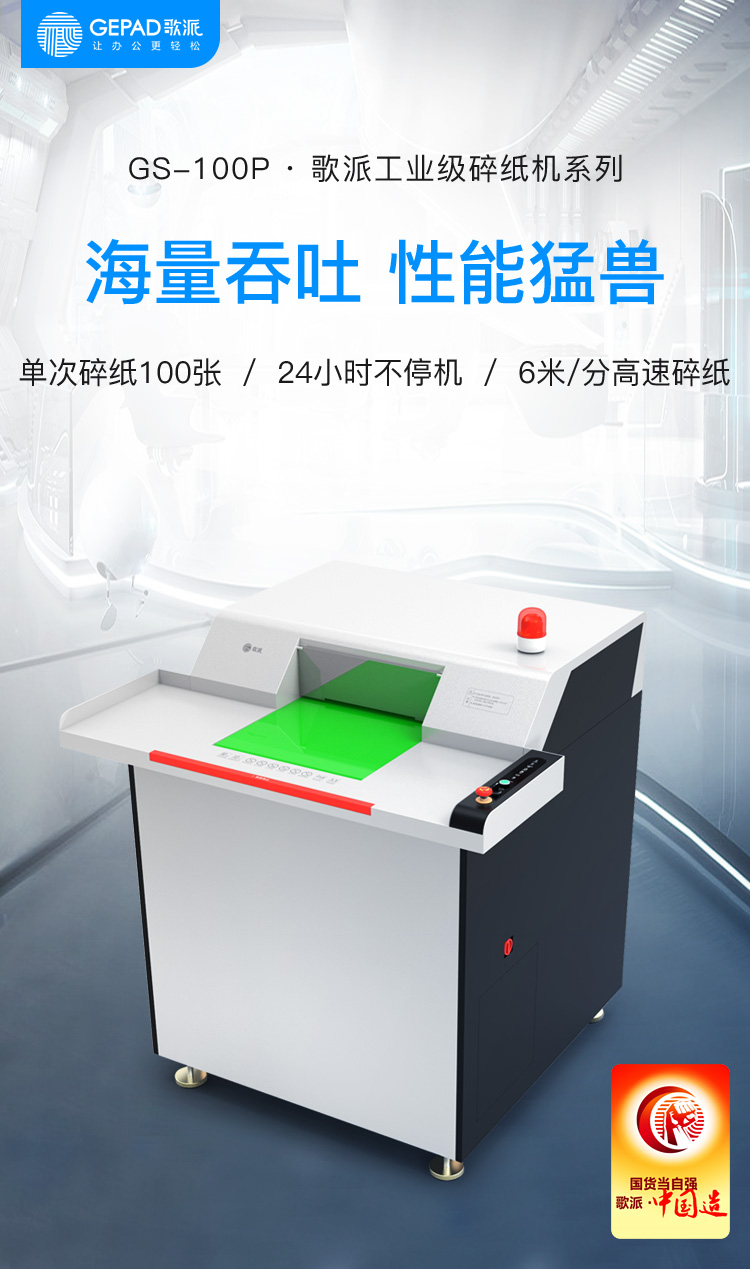 - 商品名称:歌派(GEPAD)GS-100P 碎纸机 大型大容量工业级销毁粉碎机 24小时工作 单次100张碎纸 自动加油/自动刀具维护