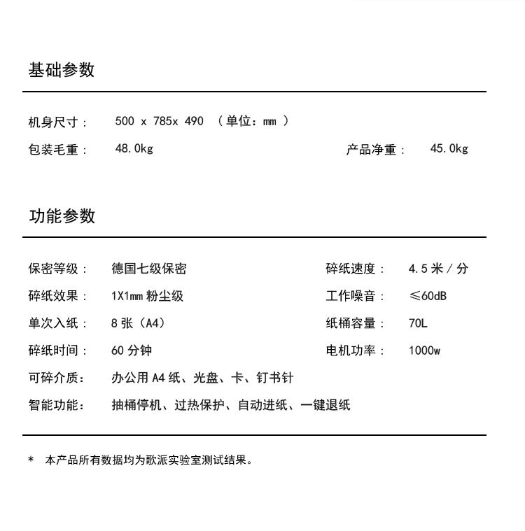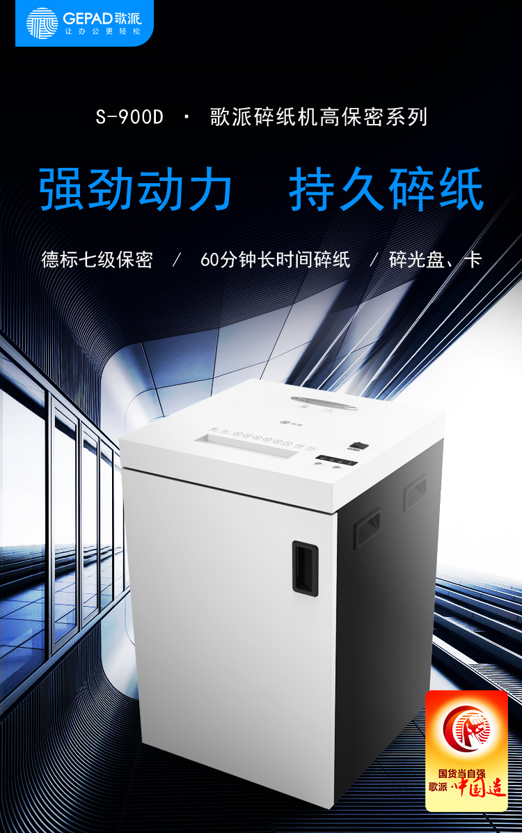 - 商品名称:歌派(GEPAD)S-900D 7级保密办公商用碎纸机(单次8张 持续60分钟 70L 可碎卡、光盘)
