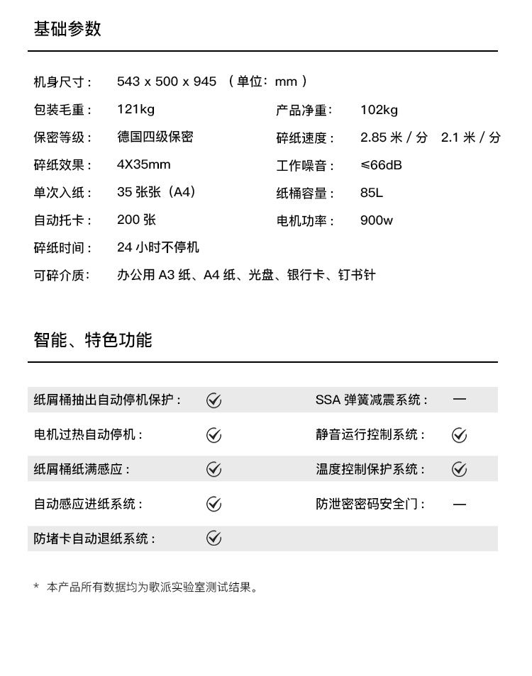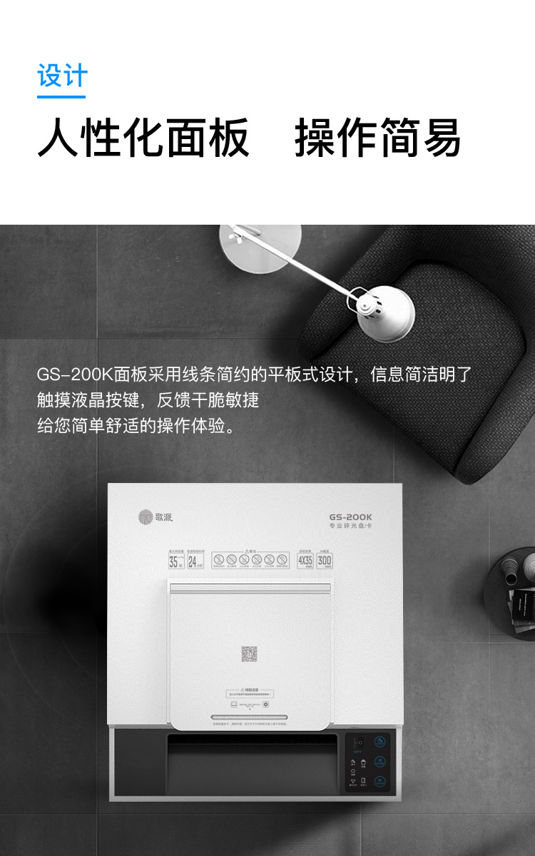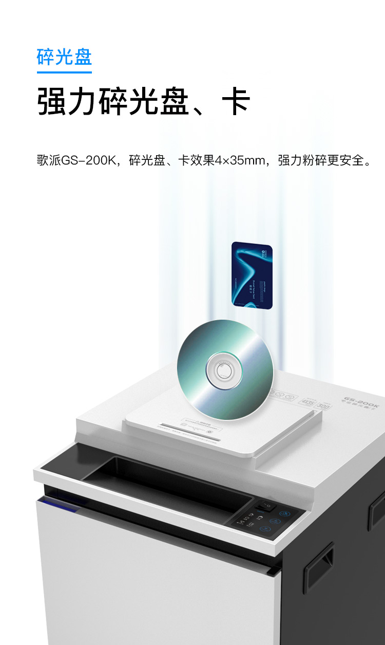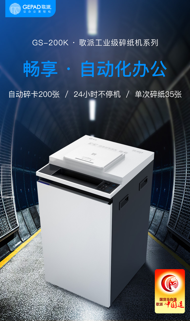 - 商品名称:歌派(GEPAD)GS-200K 4级保密专业销毁碎纸机(单次35张 持续24小时 85L 可碎卡、光盘)