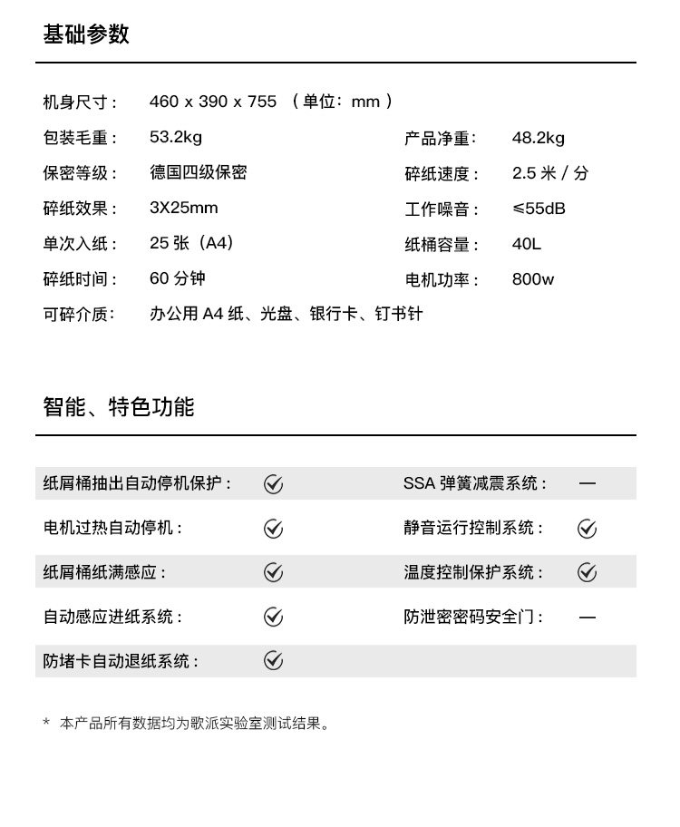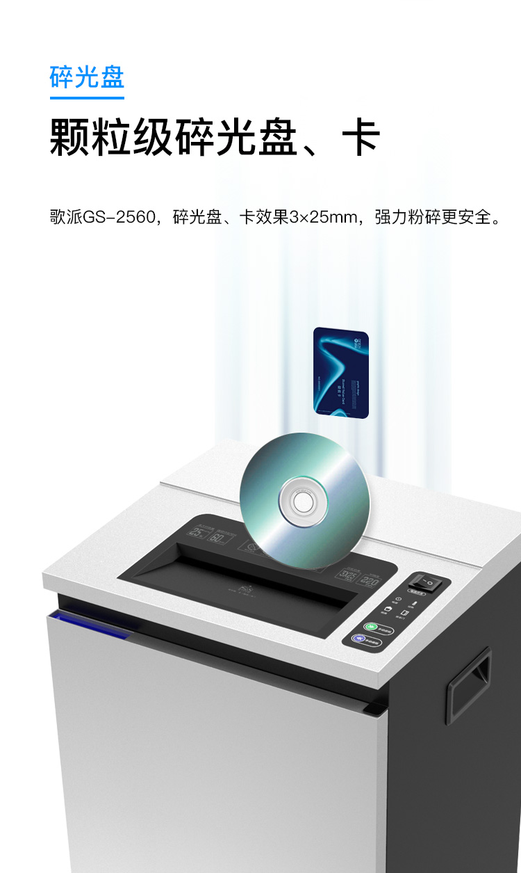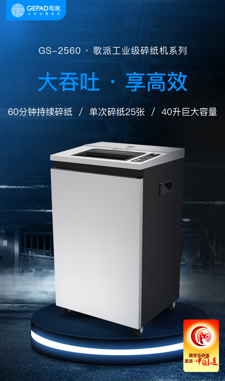 - 商品名称:歌派(GEPAD)GS-2560 4级保密专业销毁碎纸机(单次25张 持续60分钟 40L 可碎卡、光盘)