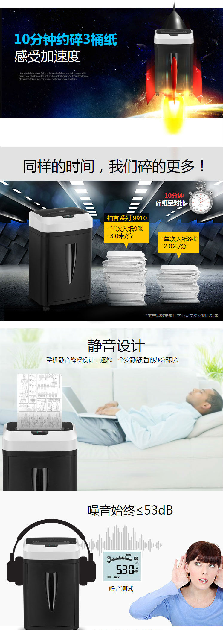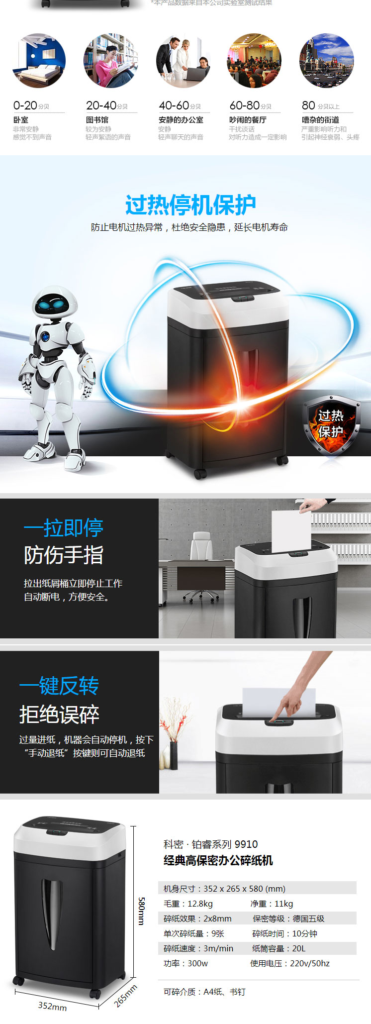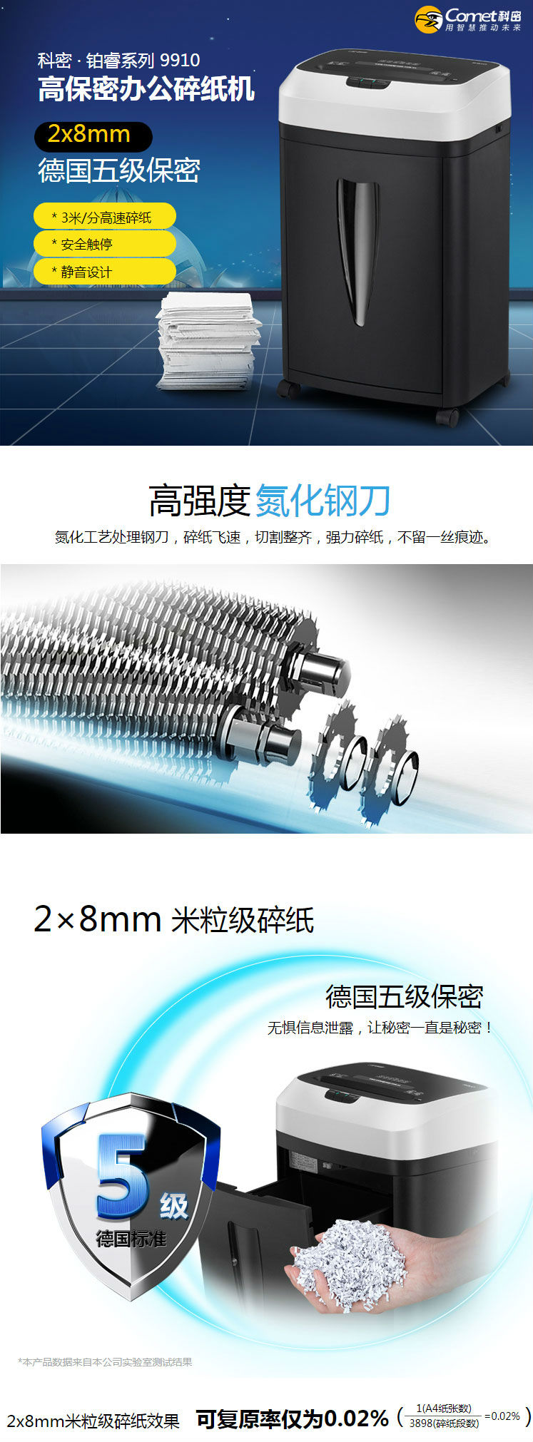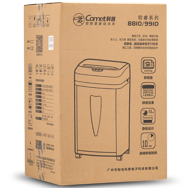 商品名称:科密(comet)5级保密办公商用碎纸机(单次9张 持续10分钟 20L 可碎卡)铂睿系列 9910
