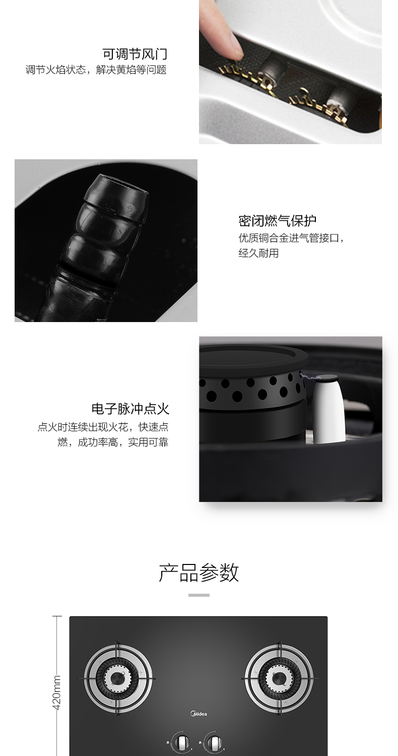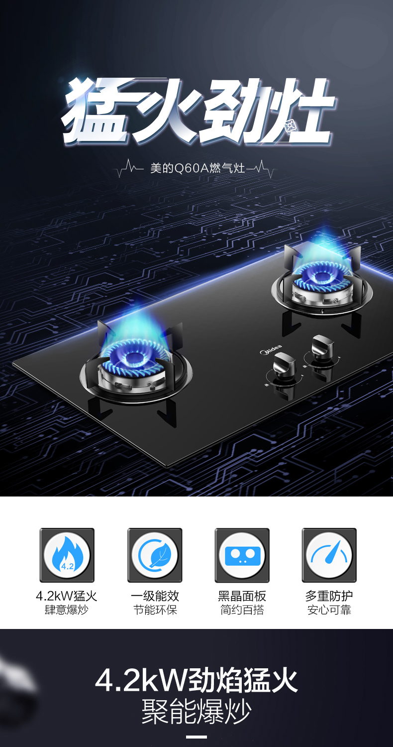 - 商品名称:美的(Midea)JZT-Q60A 燃气灶 家用 煤气灶 4.2KW大火力 黑晶面板 台嵌两用 双眼灶(天然气)