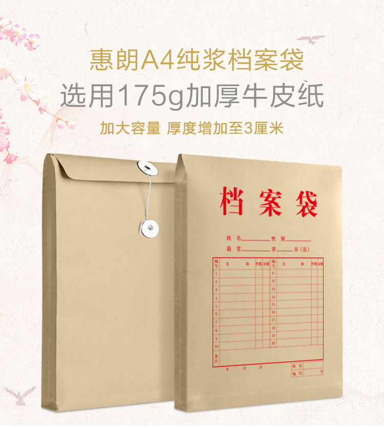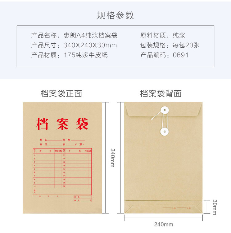 商品名称: 惠朗(huilang)0691 A4牛皮纸档案袋_纯木浆文件资料袋20只装0691