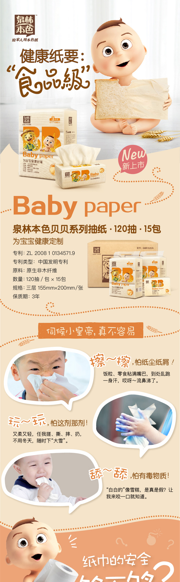 - 商品名称:泉林本色QBR120A 加厚抽纸 宝宝母婴压花3层120抽*15包(本色面巾抽纸无二噁英残留安全认证)
