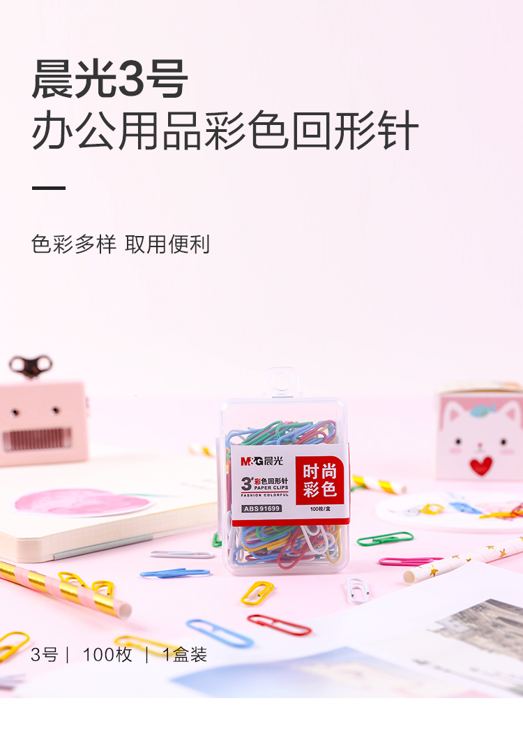- 商品名称:晨光(M&G) ABS91699 3号彩色回形针 办公家用多功能曲别针 PP盒装别针 100枚装